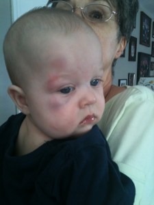 Henry took his first major spill today. He tumbled out of my mom’s arms (from a pretty low height) and bruised his face.