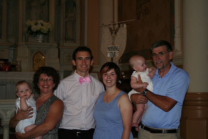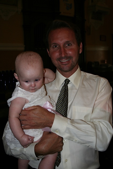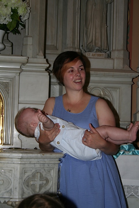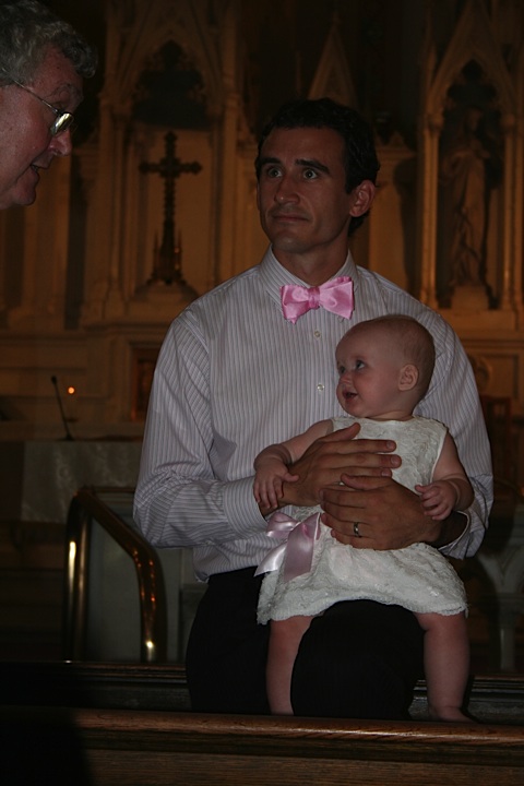 Then we had some blessings said over us and all of our family, and then we all gathered around the baptismal font. One of the lovely things about Fr. Greg is that he crowded everyone who attended up around the font. It was behind the altar rail and raised up several steps (on the same level as the altar itself), a tradition designed to show how holy such a place must be. He brought around one of the chairs that the officiants of mass sit in for Bob’s grandmother to sit on. He directed much of his explanation of the ceremony and the meaning behind it to our three-year-old niece, Brynn. He involved everyone. It felt very special – and I’m not particularly religious. But it was executed with such tenderness it made me feel comfortable bringing my children to that tradition.
