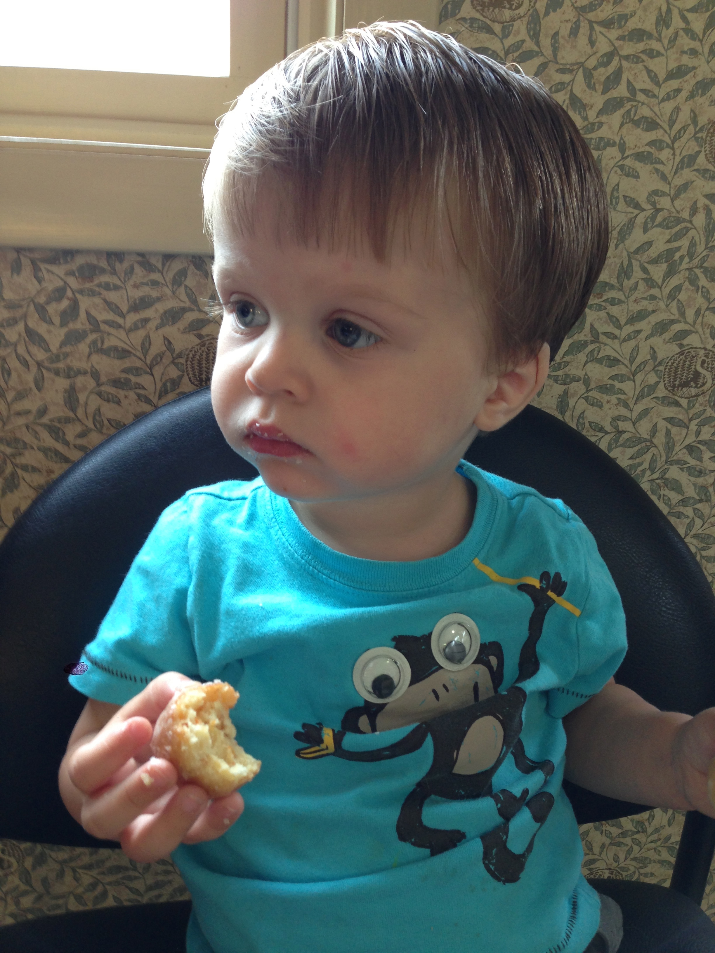 Yesterday I took Henry to get a trim. I went to pick him up at daycare directly following naps. I snuck in and the lights were still out, but his teacher had gotten him up and they were cuddling.Then my sleepy boy and I went to Tim Hortons for a snack. After taking one bite of bagel (a favorite, usually) he switched to Timbits and never looked back. He also loved the sound of his straw when he slid it in and out of the water cup.