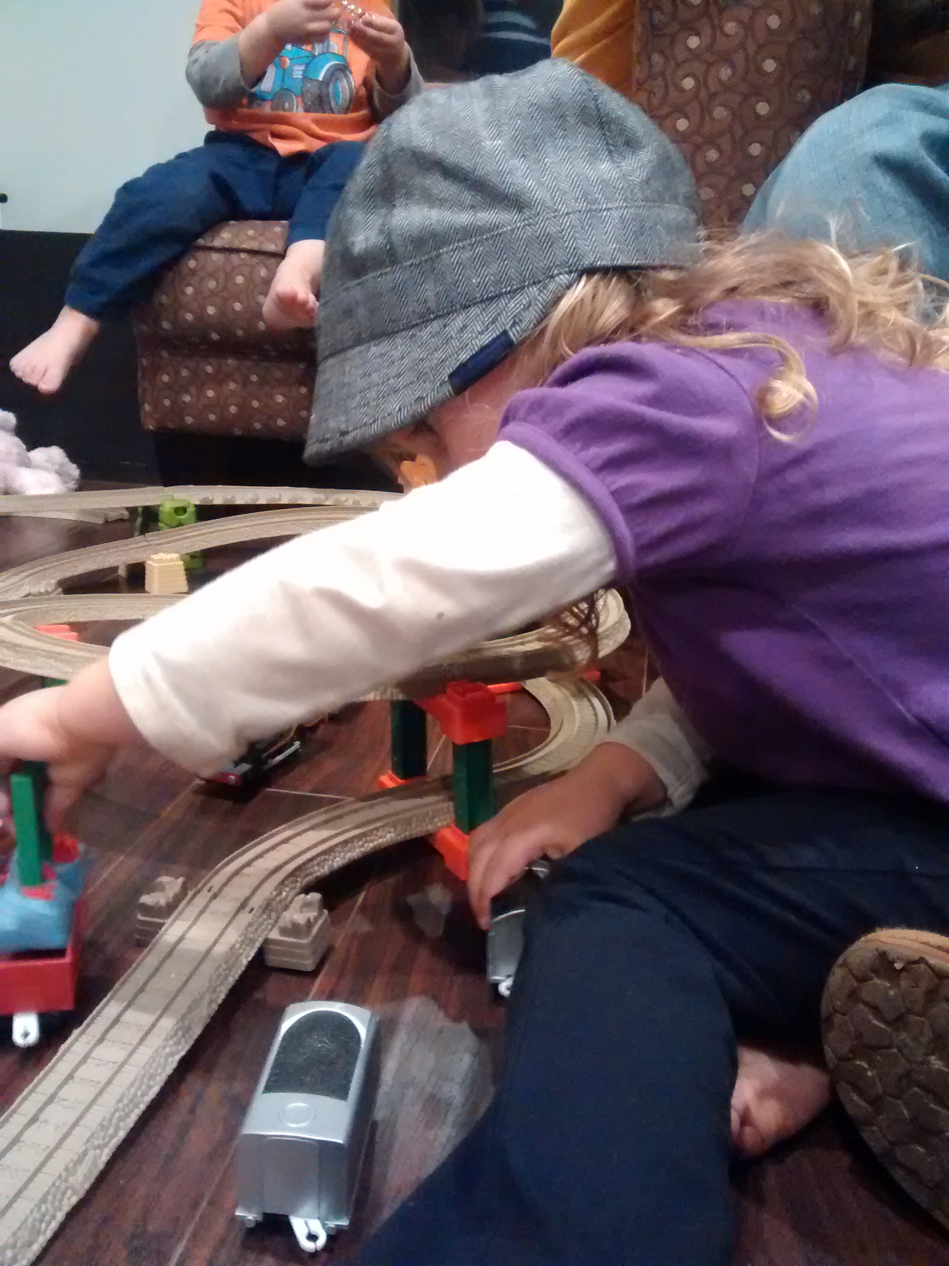 Last night we were playing with the kids and Ele jumped up and started rummaging around. When I asked her what she was looking for, she said a train hat. One of my hats was as close as we could find.