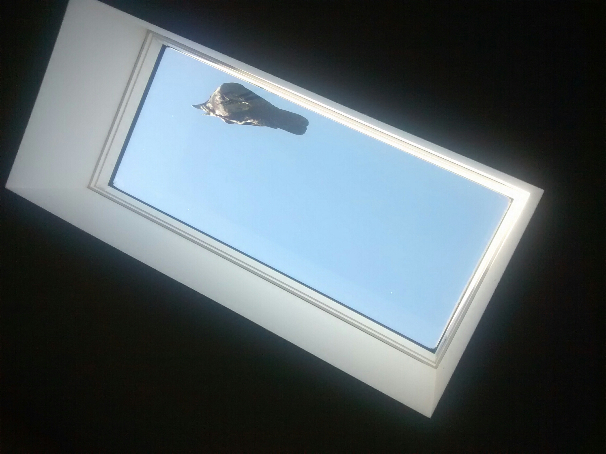 The crow was up on the skylight, walking around and pecking occasionally. Eventually he flew away.