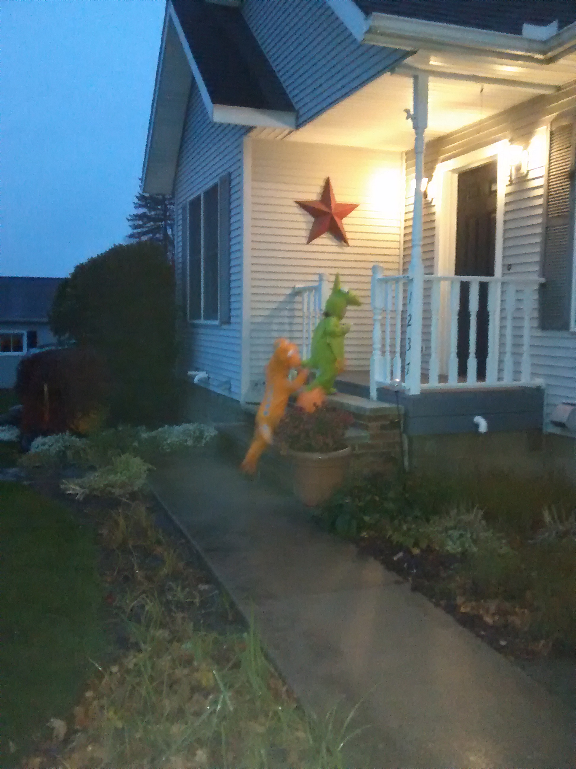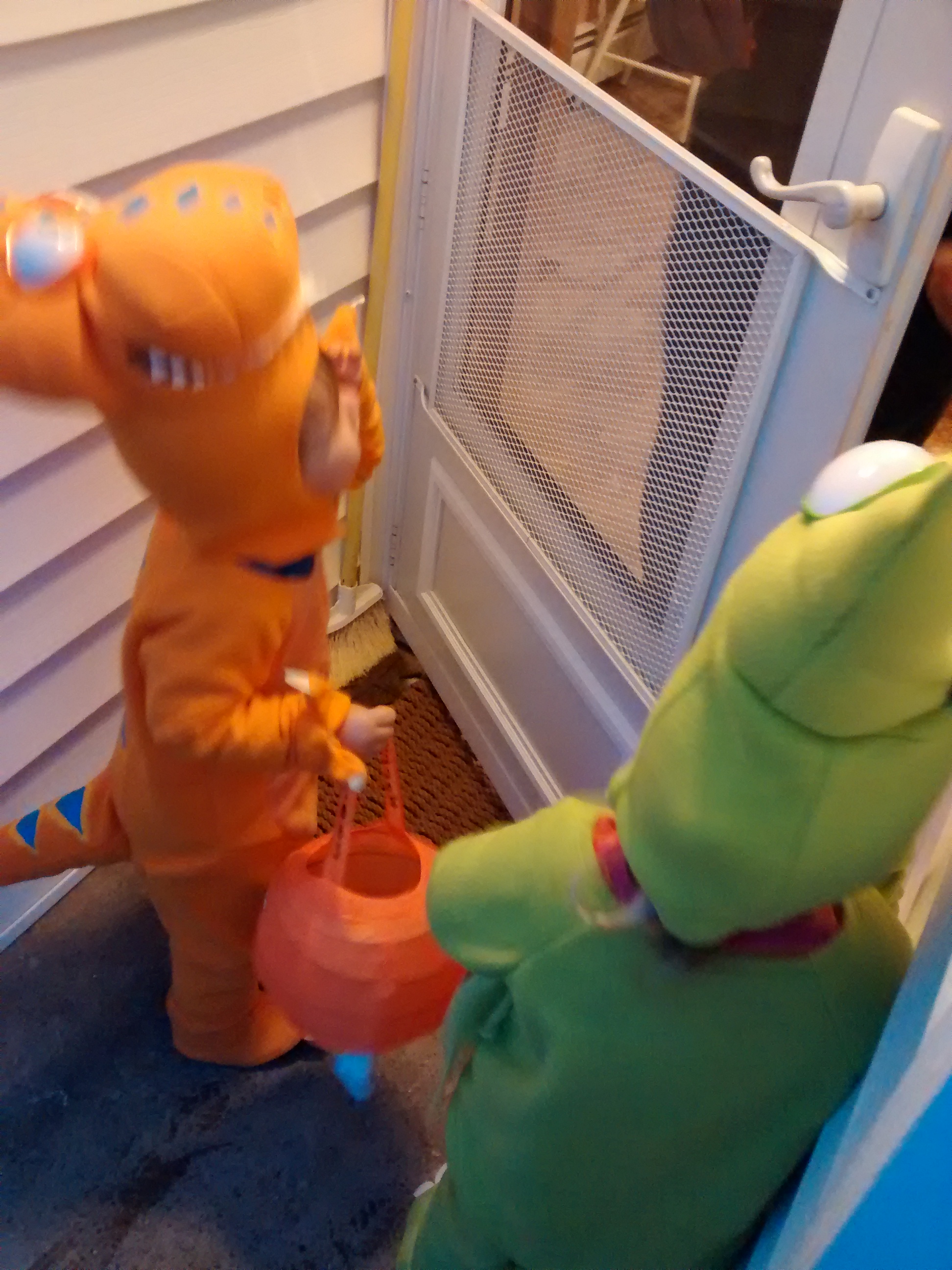 We visited the houses in the neighborhood trick-or-treating today. The people around the neighborhood visually know the babies, so Halloween is a nice time to show the babies and their manners around.