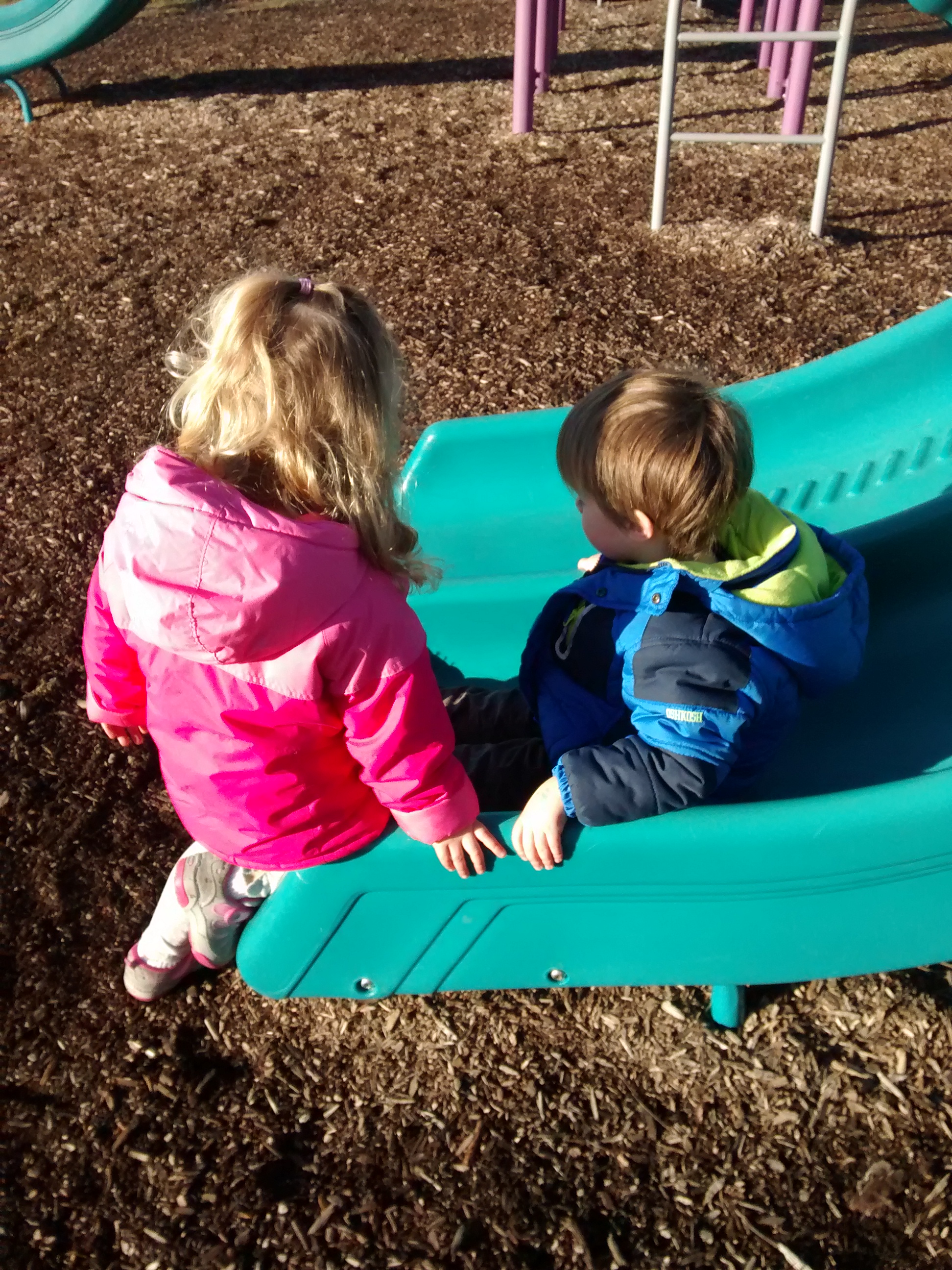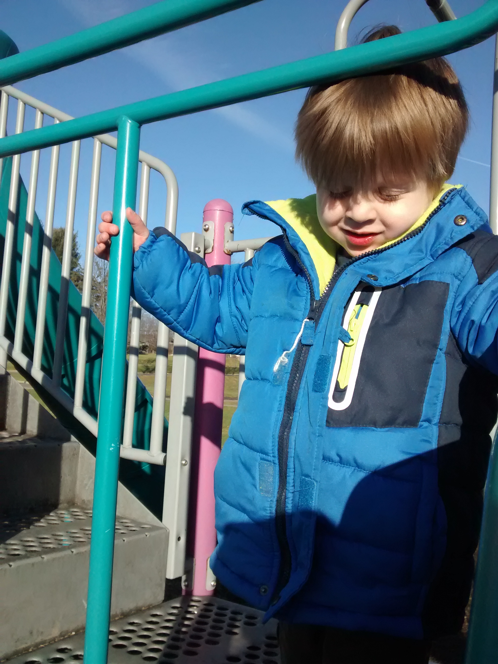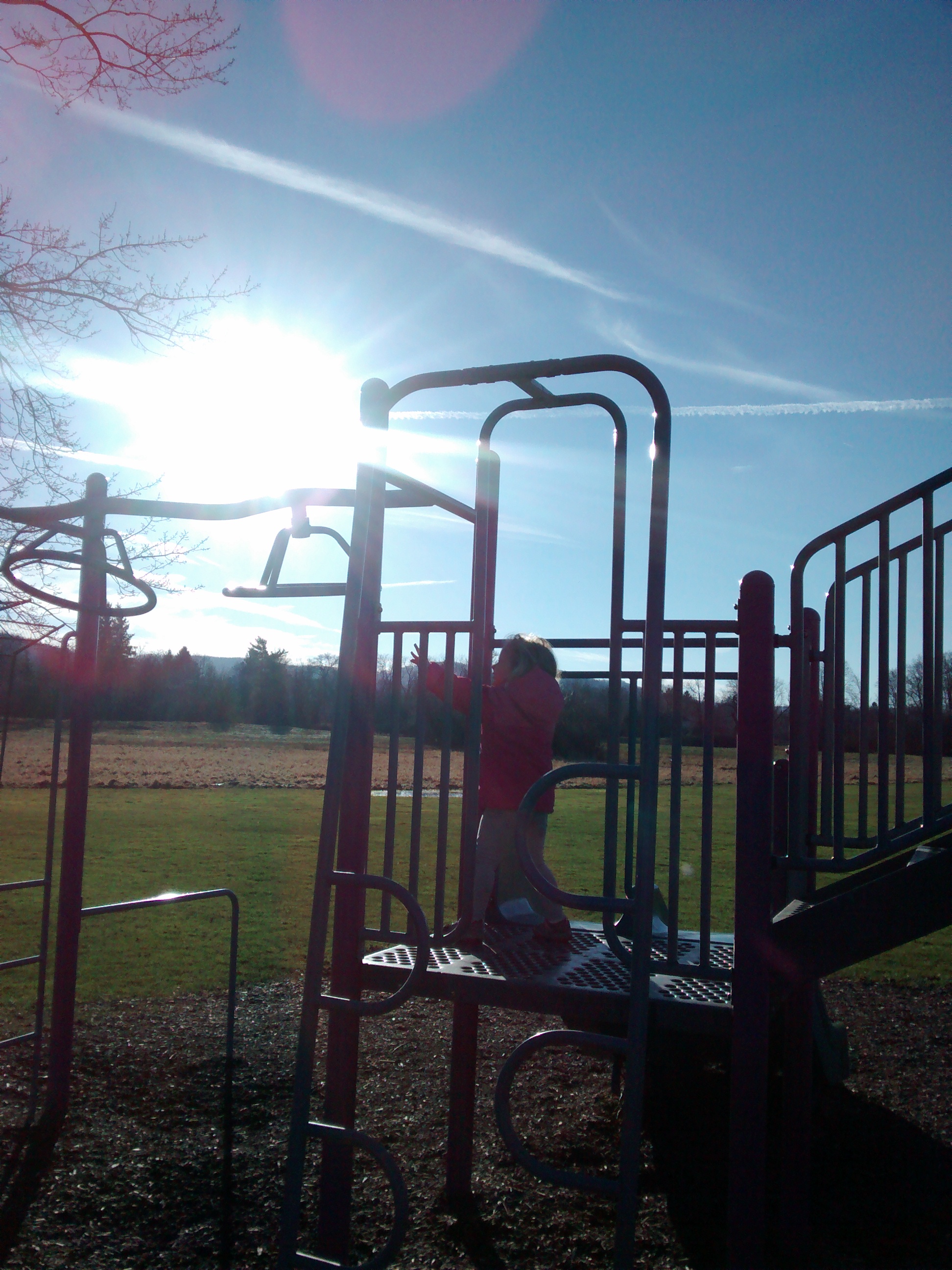 Yesterday, sunny spots hovered nearly to 60 degrees (shady spots somewhat cooler), so we went to the playground.