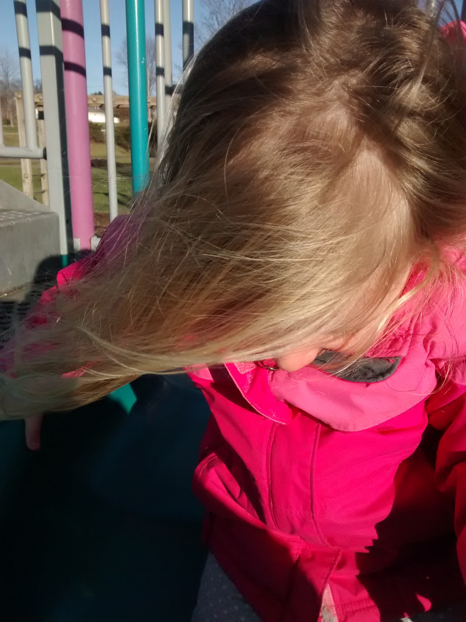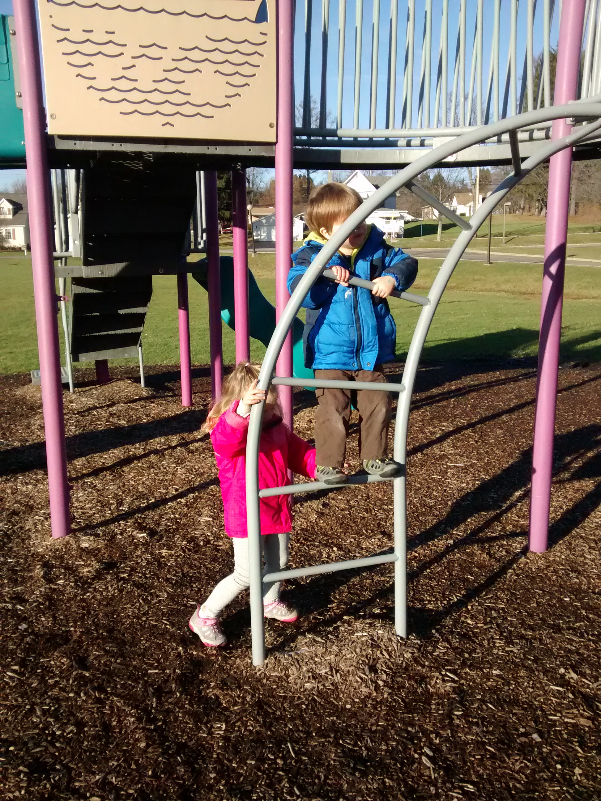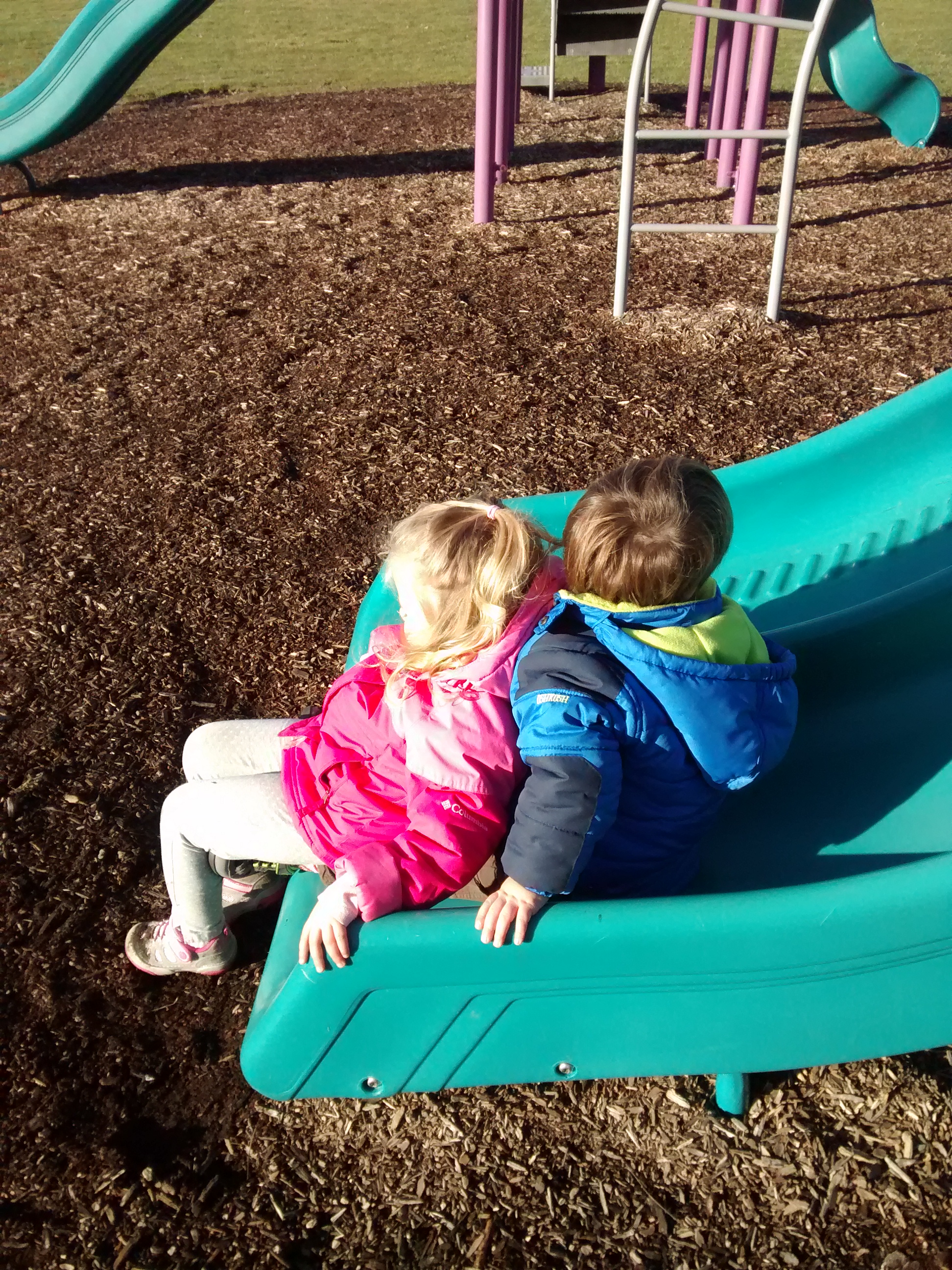 Yesterday, sunny spots hovered nearly to 60 degrees (shady spots somewhat cooler), so we went to the playground.