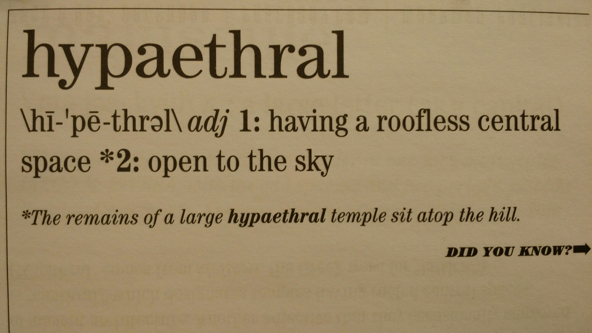 late 18th century: via Latin from Greek hupaithros (from hupo ‘under’ + aithēr ‘air’) + -al.