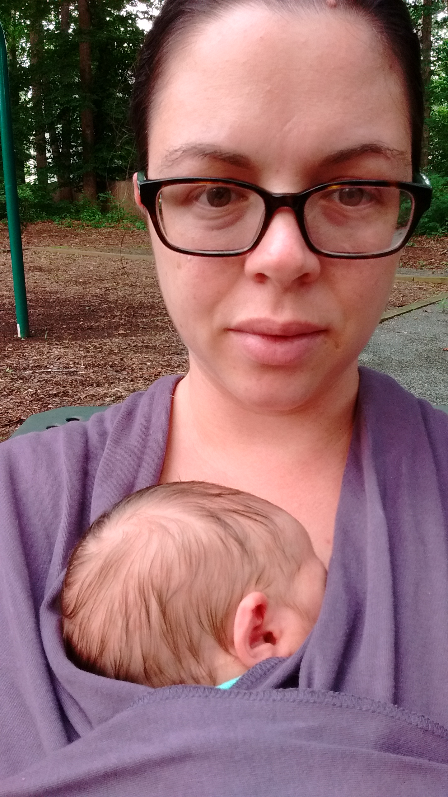 Our first day home, on Saturday, we took a walk to one of the playgrounds in the neighborhood so the big kids could play. I wore Grant, as I’m used to him on me, and he was very happy about it. He snuggled in. I look tired because I am tired.