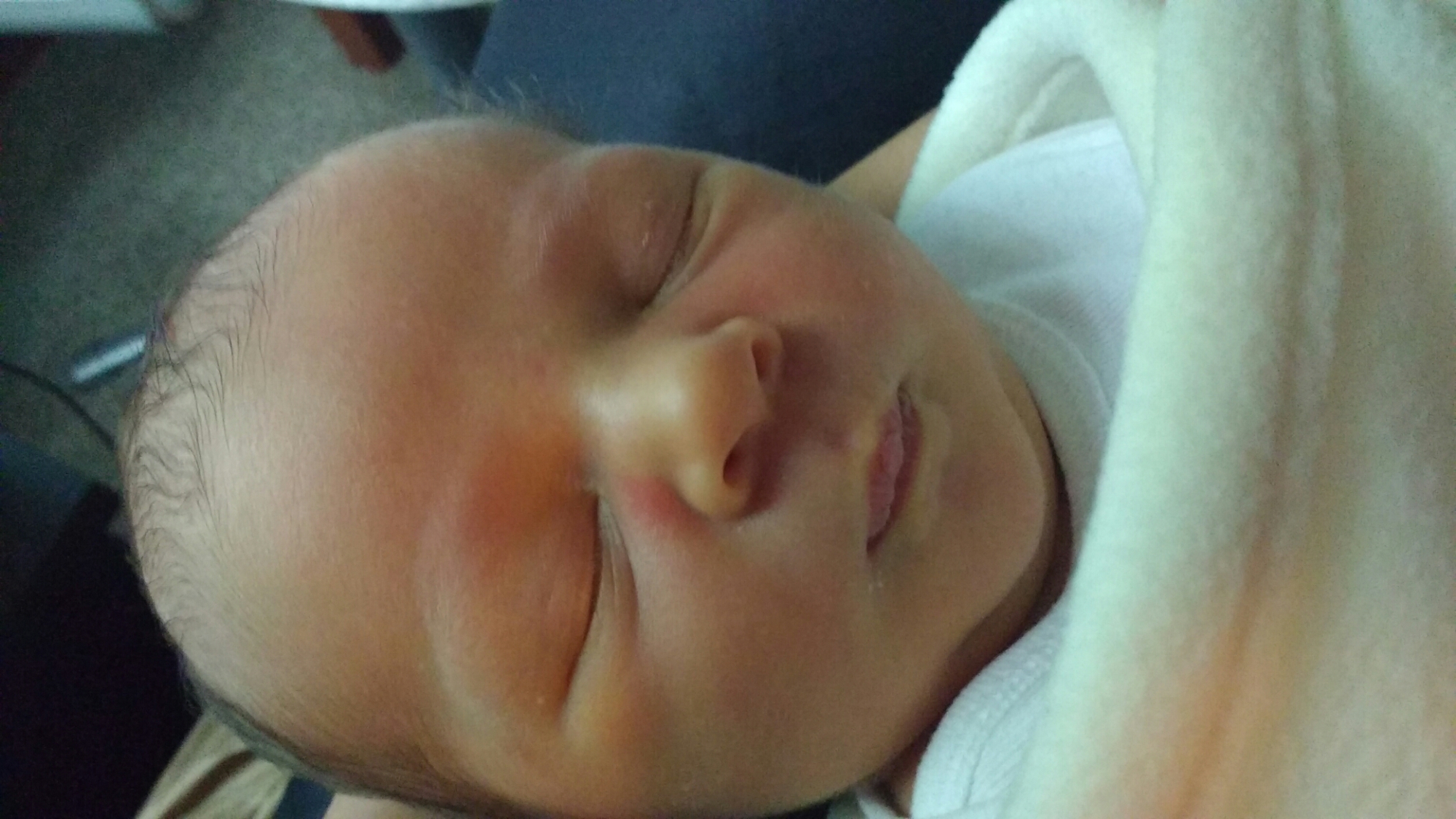Sleeping this morning after a big feed. We slept much better last night, we were able to have two longer naps – one an hour and a half, and one two and a half hours. Then from about 9am to noon, we both slept while Bob made pancakes for the big kids and kept them busy.