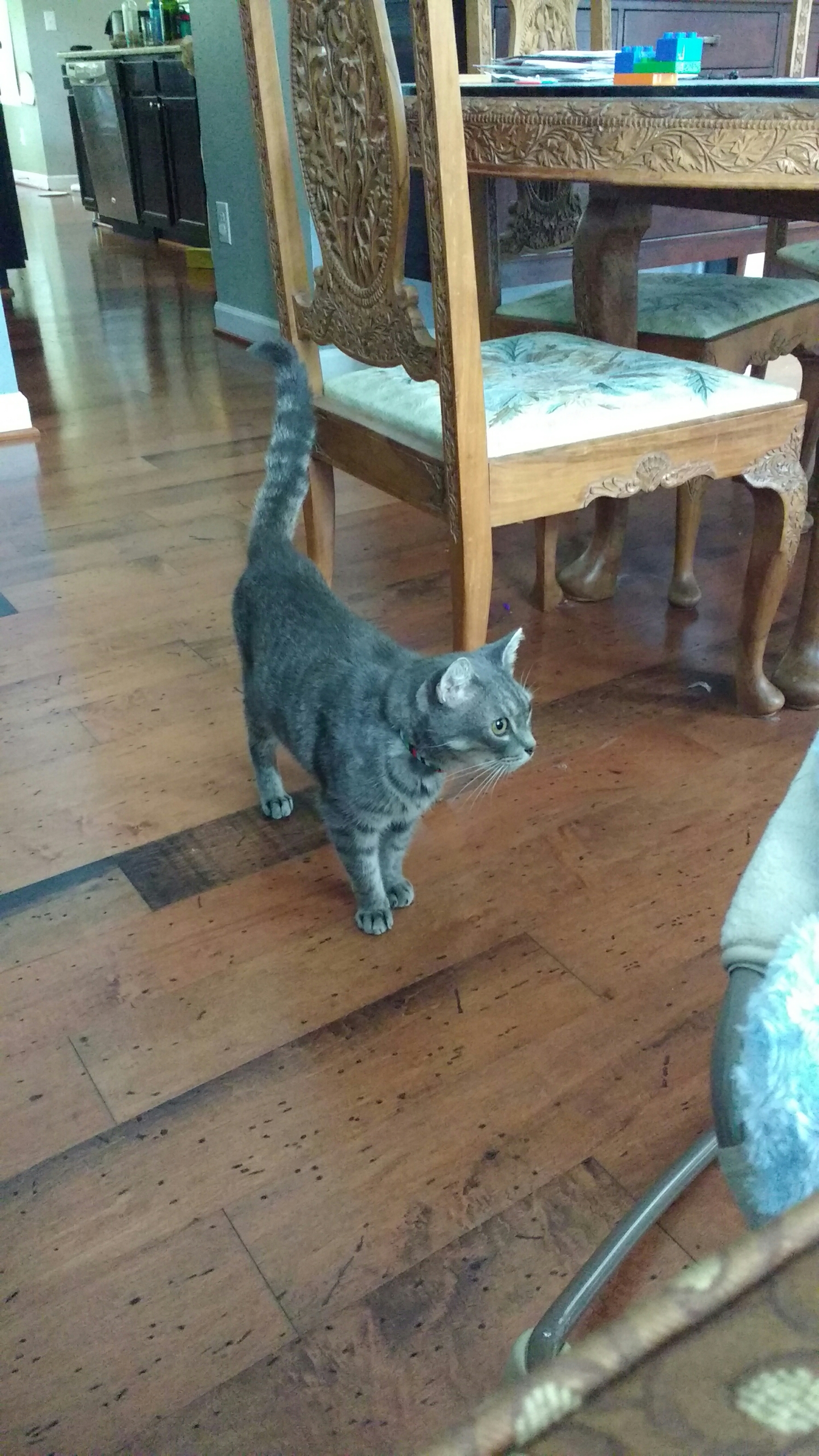 He is fine wearing a collar, which is nice because I can hear him jingling as he trots around the house. His tail has a significant kink in it, as though it was shut in a door. It doesn’t seem to bother him, however.