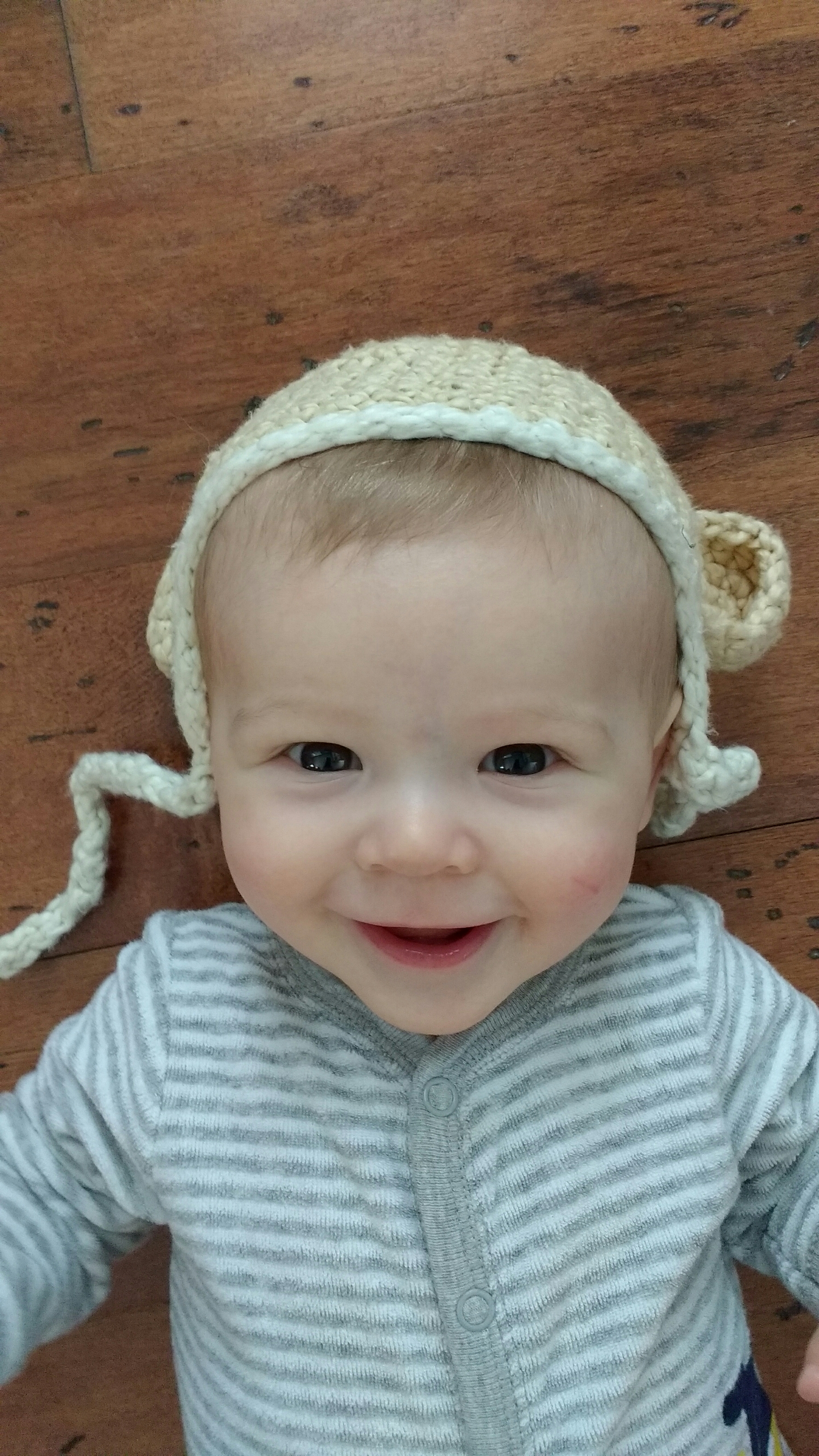 Henry’s newborn monkey hat doesn’t fit this six-month head! But he was delighted to try it on anyway.