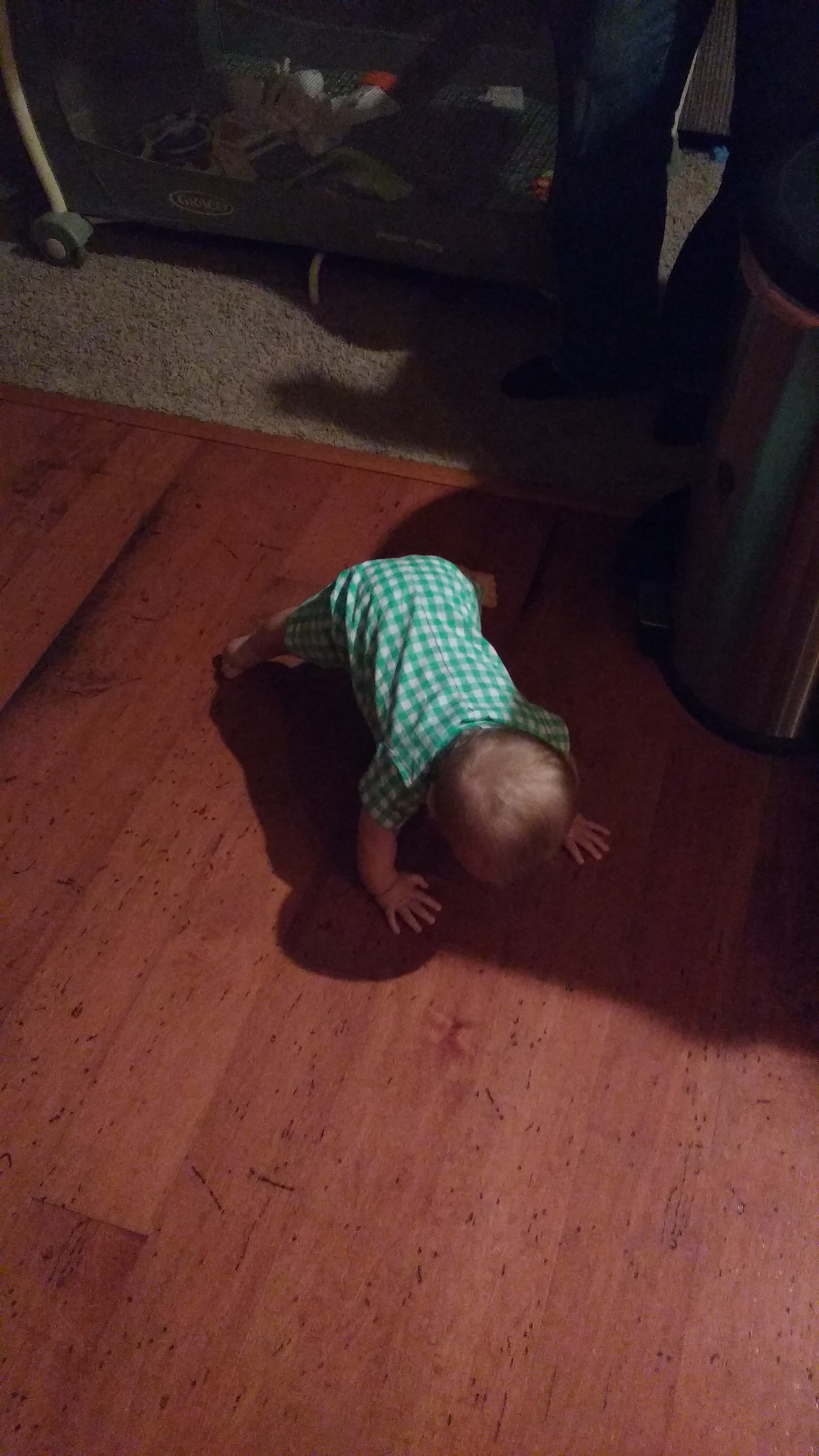 Besides pigeon pose, Grant also practices planking and downward facing dog (and upward facing dog for that matter). Here is one of his planks that he transitioned into down dog. Now, his form isn’t perfect, but he is a baby, so go easy.