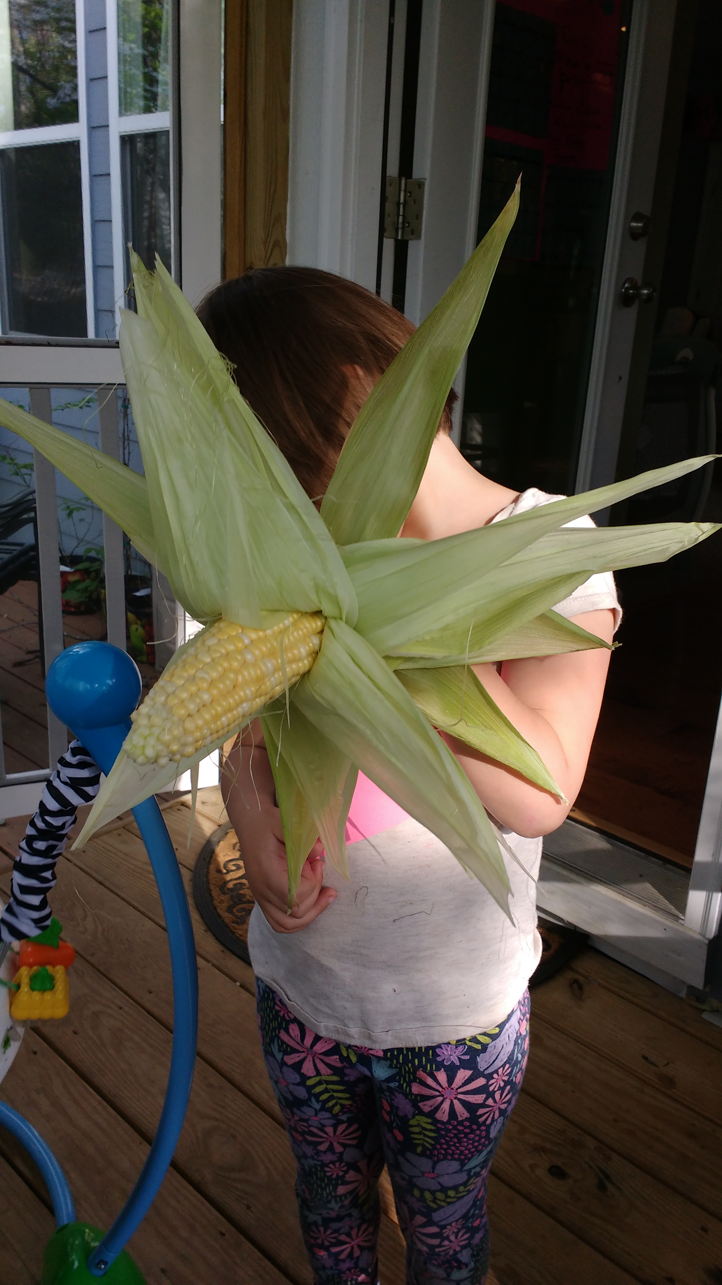 Eleanor helped me husk the corn the other day, and her method, while unconventional, is very pretty.