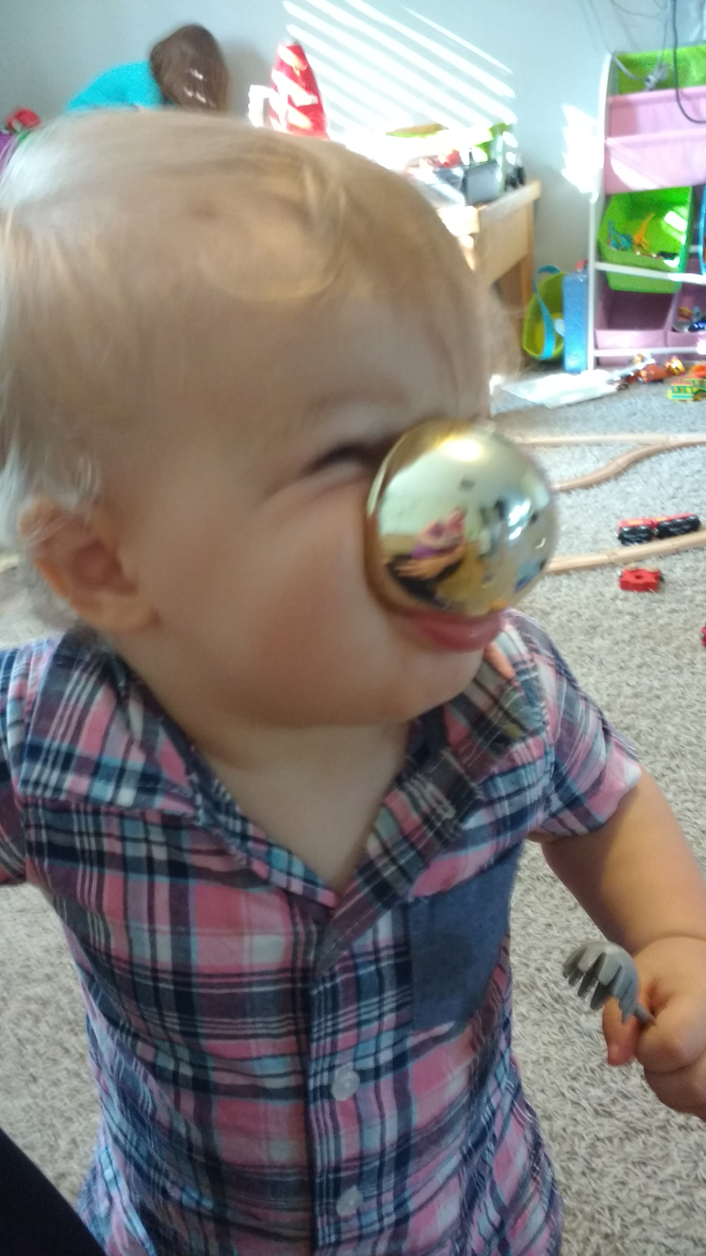 He likes to carry things in his mouth right now, including half of a golden egg.