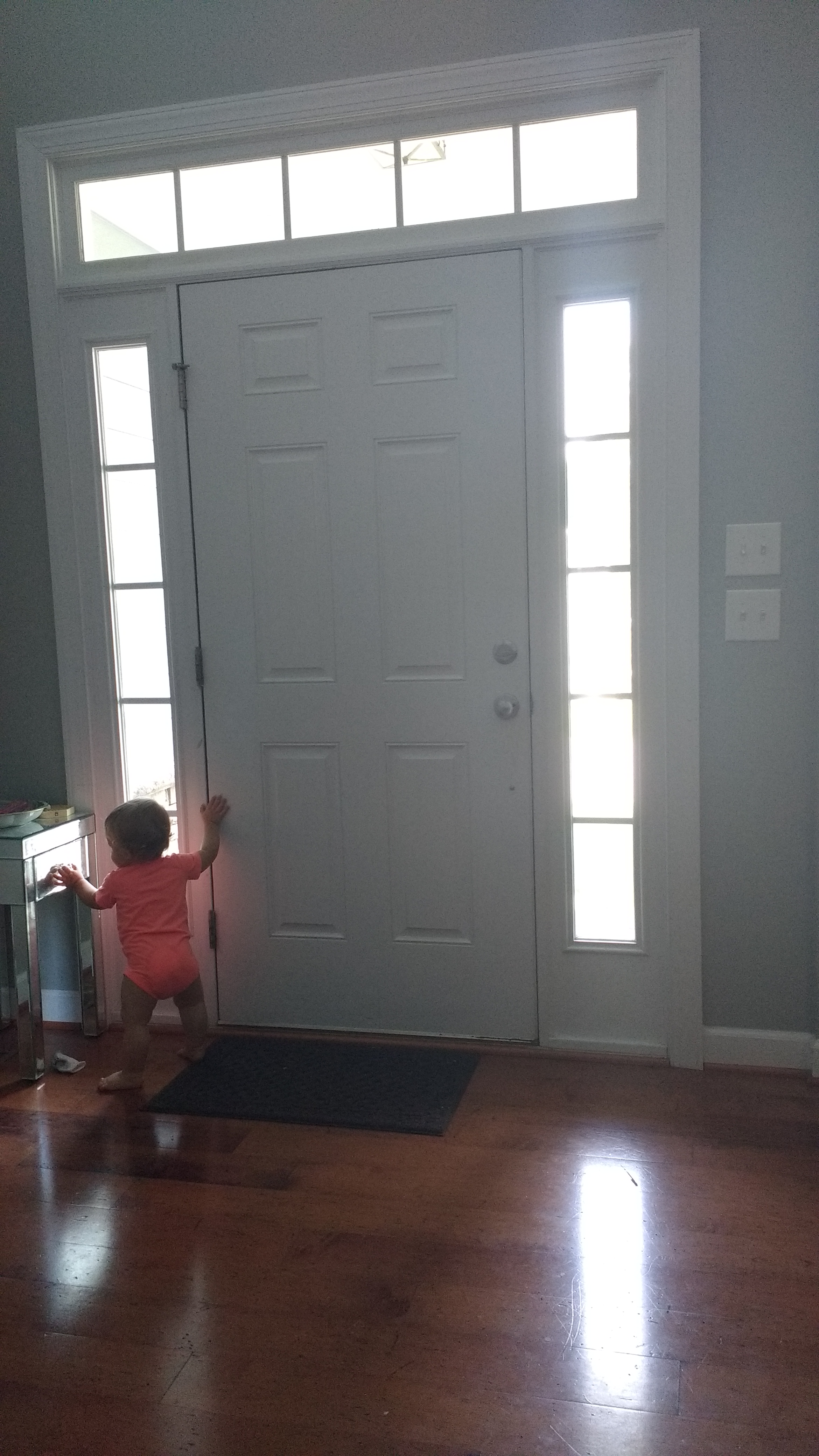 Grant went to the door to watch his nanny leave and said “bye!” through the side light.