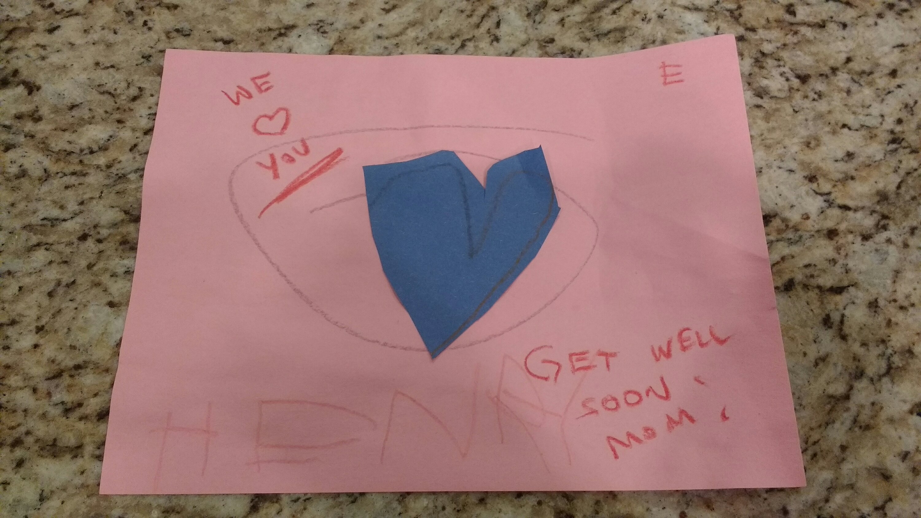 The kids made me get well cards (with a little help from Bob). Henry likes to cut out shapes, so he cut out the heart. The squiggles on the bottom left of his card says “mom I’m sorry you’re sick and I hope you feel better soon” ❤❤❤