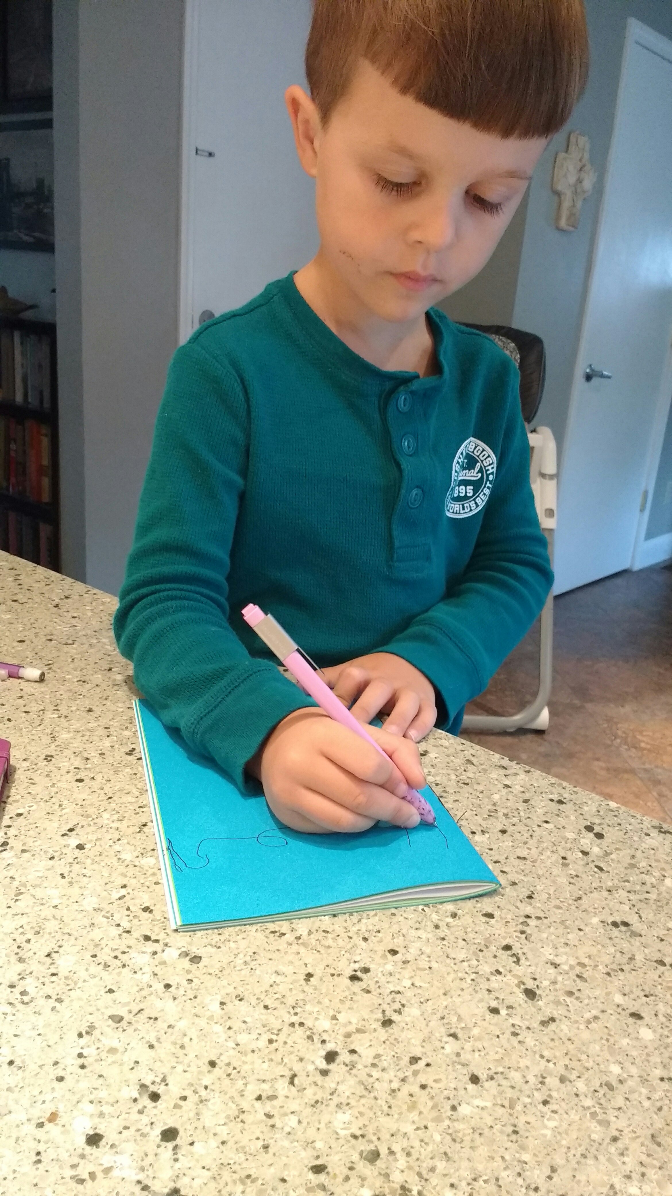 That thing where your son is upset he filled up his notebook and wants another, but there aren’t any in the house, so you bind one for him. [3 photos]