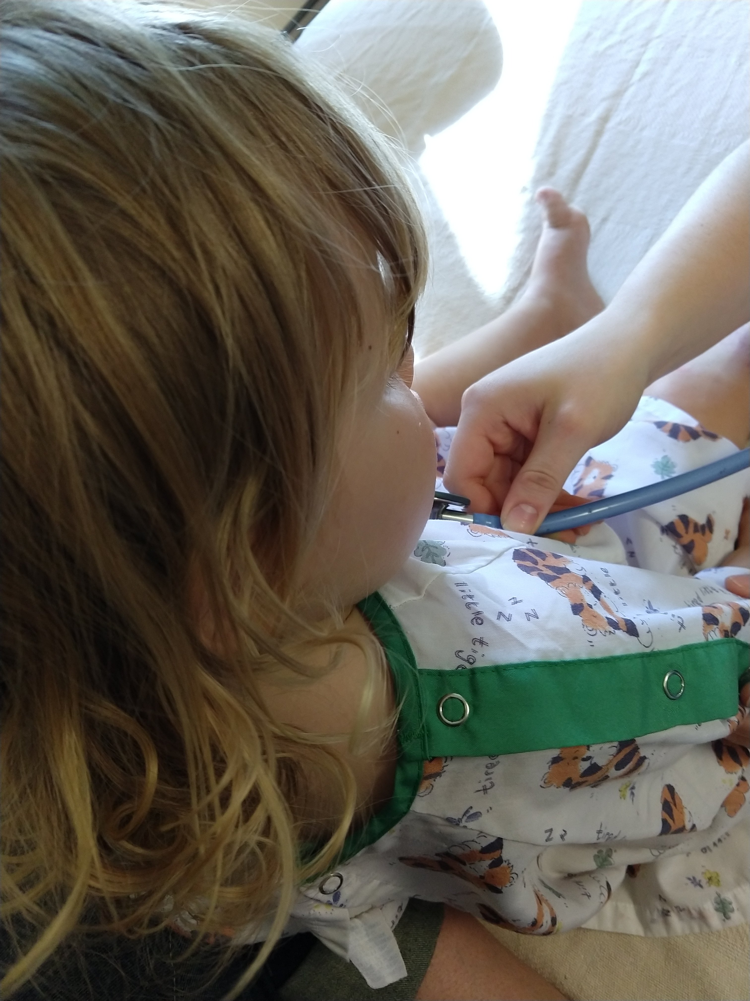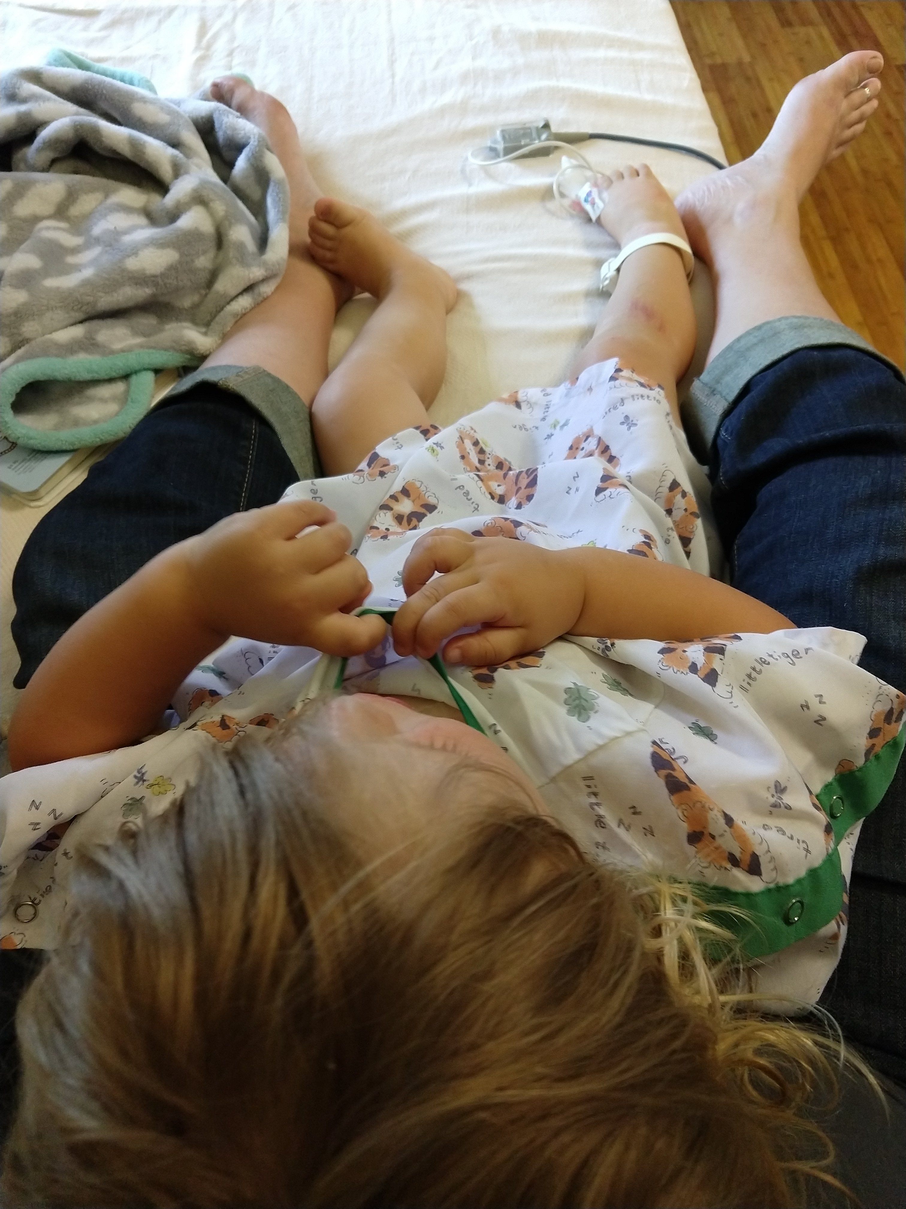 Grant got admitted to the hospital for the night. He’s under observation for his lungs, and he may develop an ear infection but that’s really ancillary. Baby hospital gowns ๐ญ