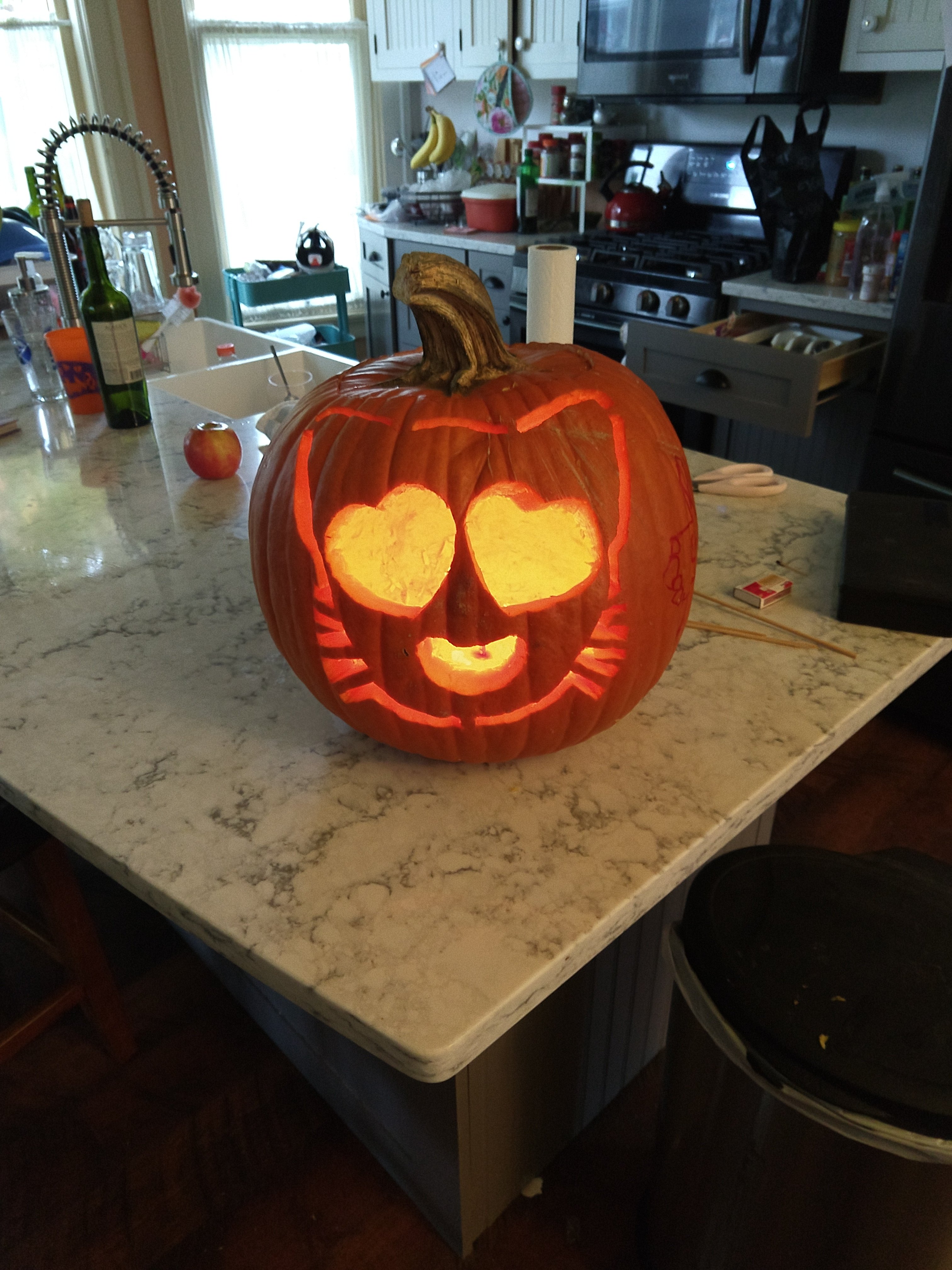 For Halloween, Ele asked for a heart eyes cat emoji (π») pumpkin. I couldn’t find any to copy on the internet (THANKS FOR NOTHING) so I created my own pattern. First, I took the emoji and cropped it so it would be big enough to see properly. Then drew a template, pinned it to the pumpkin, and transferred the pattern to the pumpkin but pushing a mechanical pencil tip through the pattern, all around the pattern. The finished product isn’t as detailed s he template because this alone took me hours and I was tired. Here are my steps visually: