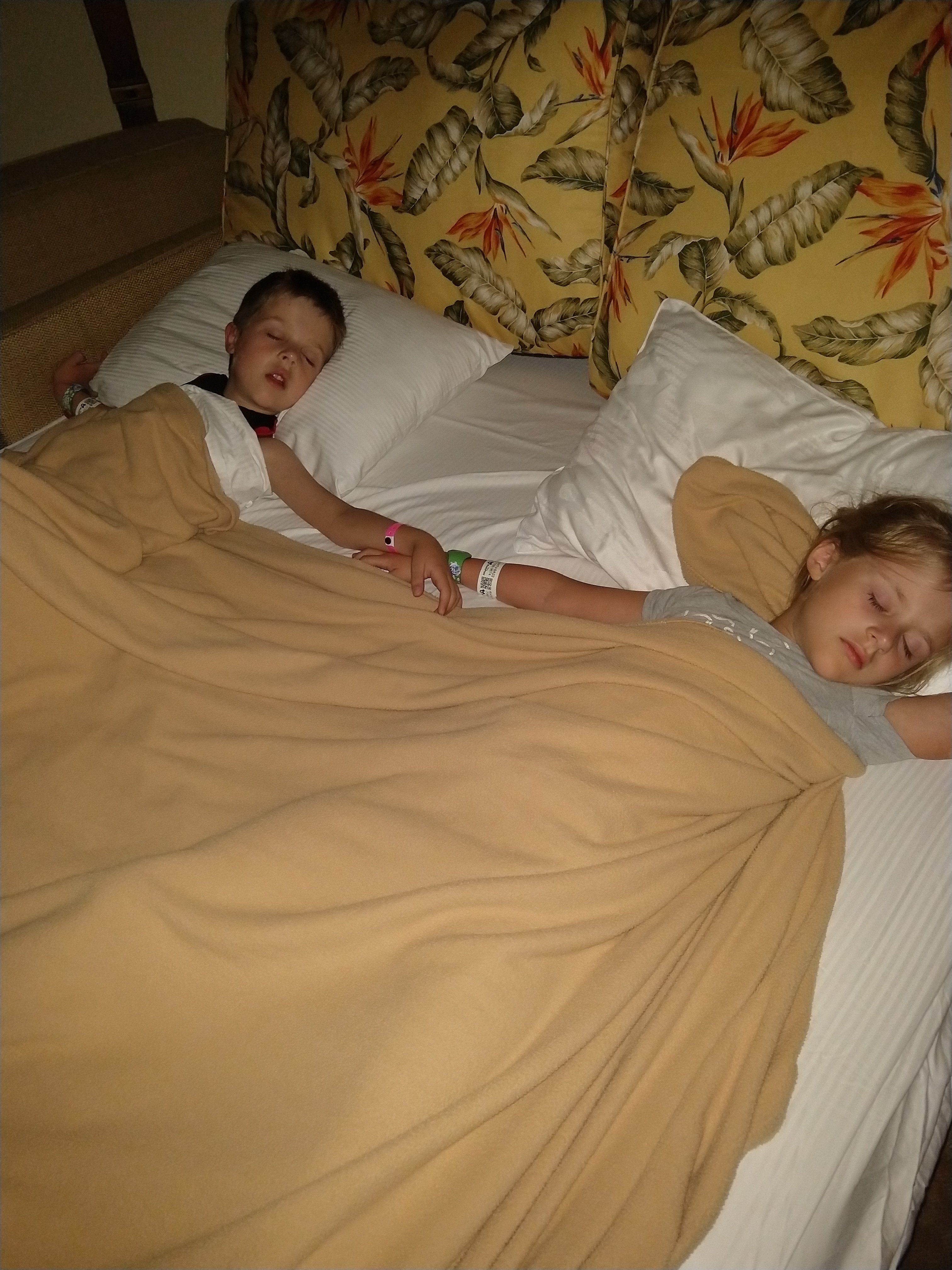 After a day of playing at Aulani, the twins fell asleep with their hands touching.