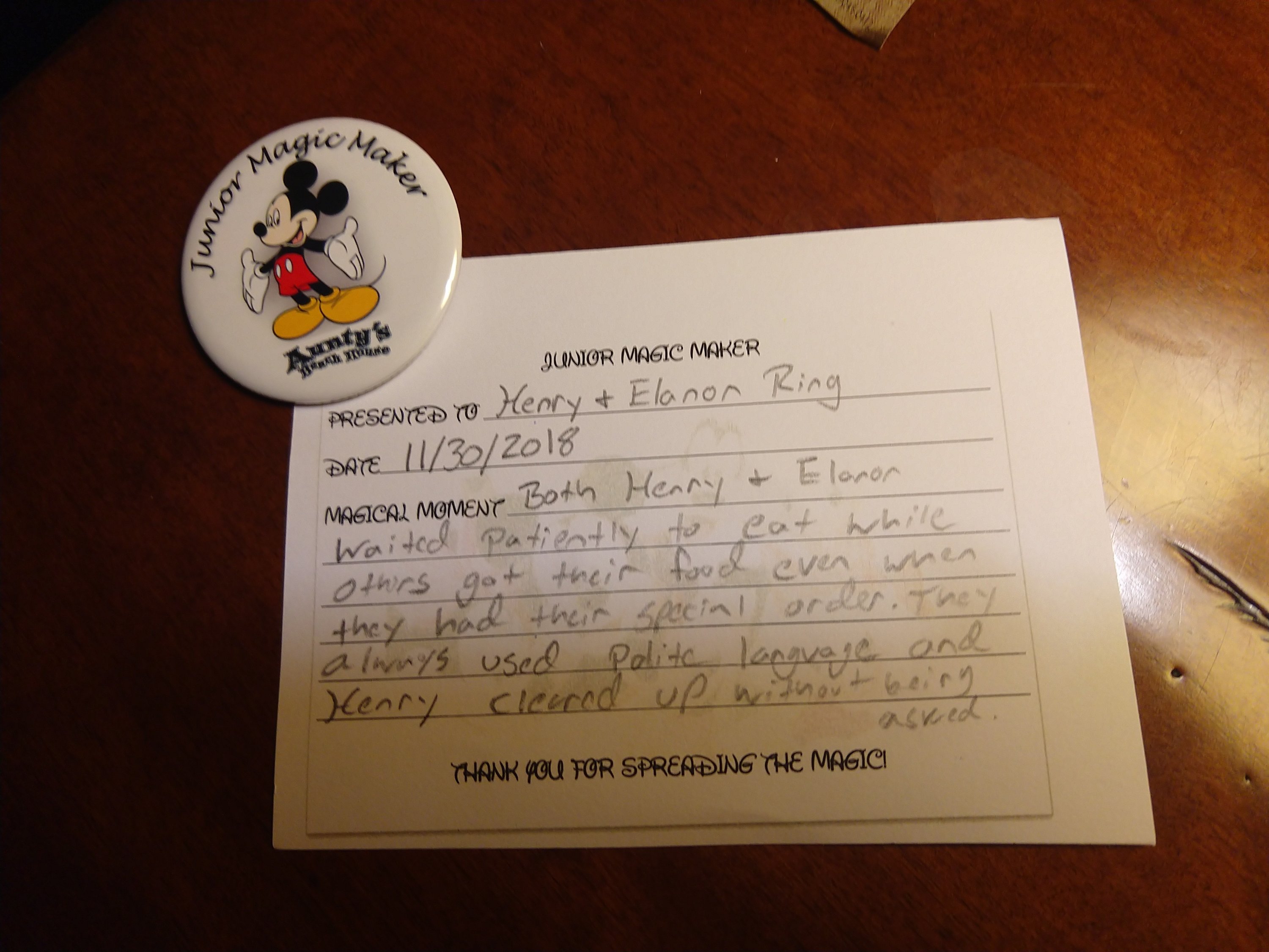 Something really special that happened was that the twins got a special certificate and some buttons from the kids club at Aulani. They were very polite and patient (they needed special meals that took longer to prepare), and Henry even cleaned up after himself at dinner.