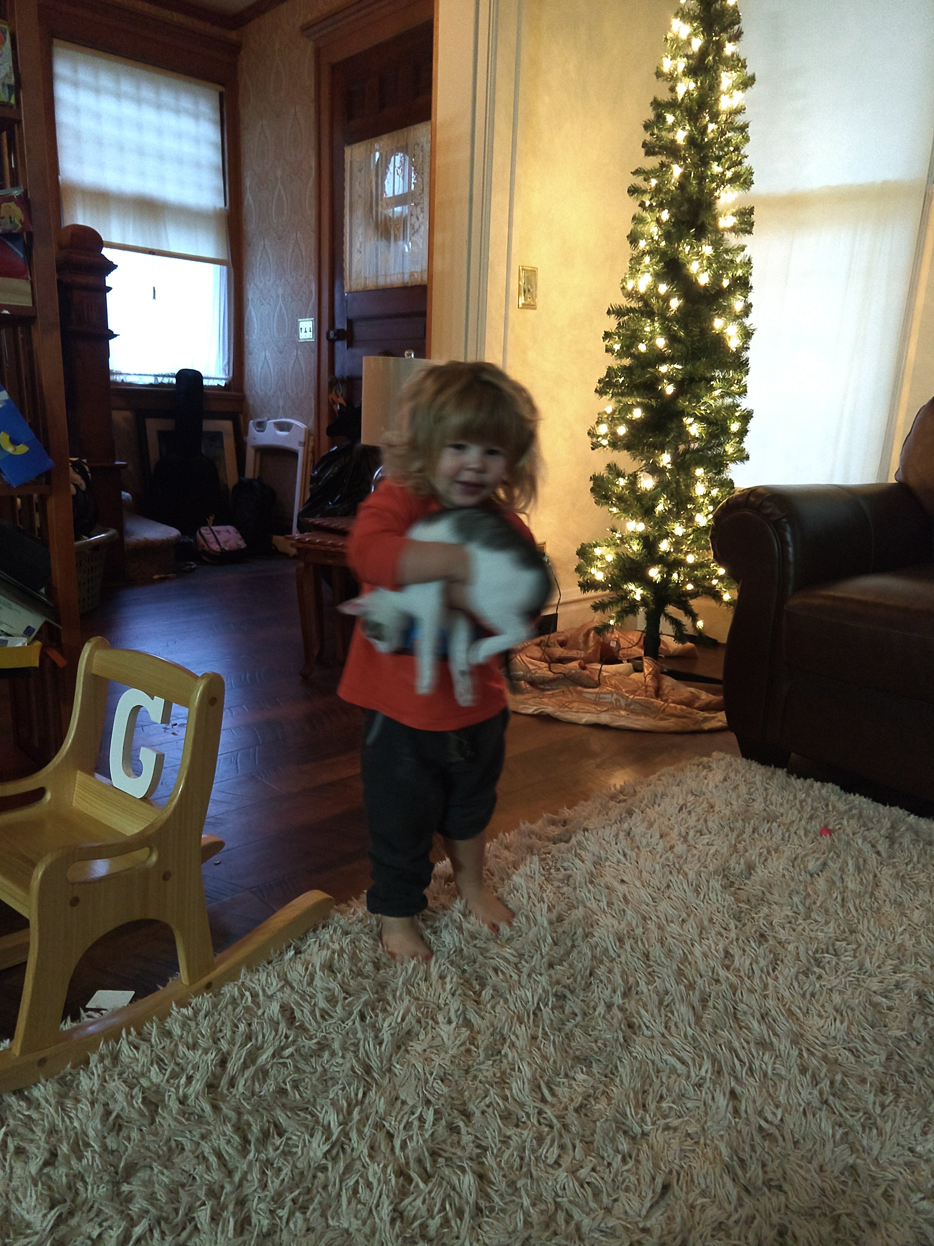 Grant sure loves carrying the cats around. He tries to only carry around his cat (“my kittycat?”) But he sometimes gets one of the other two.
