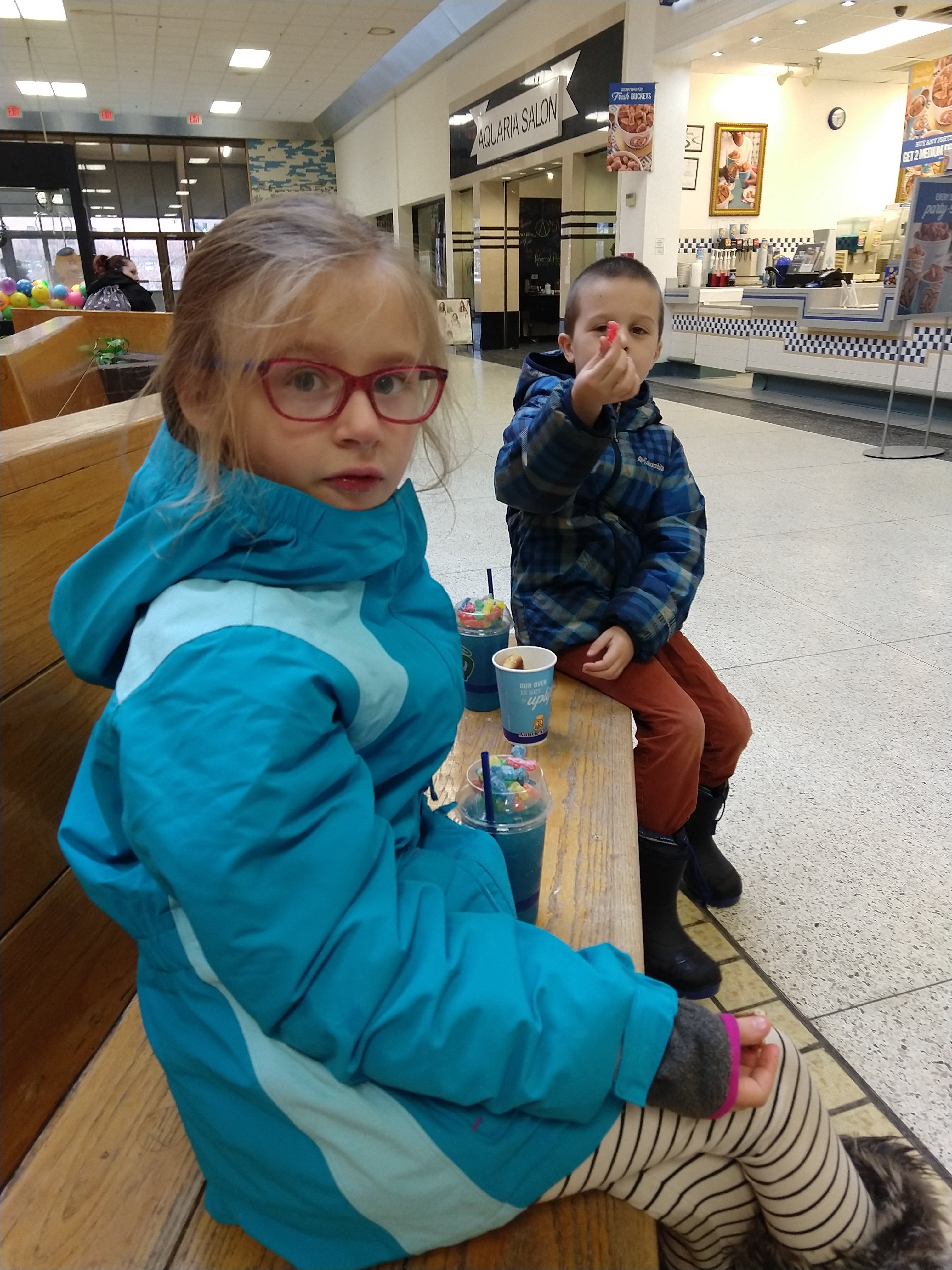 Even with rain, high 30s temps, and high winds, the twins and I needed to get out of the house. We went on a muddle (a walk where you look for mud puddles to jump in), and found ourselves at the mall. The kids knew a secret item to order at Auntie Anne’s, which was sour patch kids on top of their lemonade. Who knew?! Then we loitered in Bath and Body Works. The kids got to pick out two things, so we left with two unicorn sponges, one unicorn bath bomb, and one hot dog hand sanitizer. Then we ordered a pizza for dinner from Rennas and hit the arcade. It was a full afternoon!