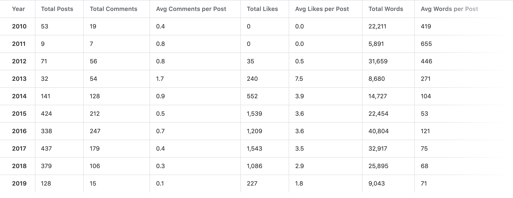 Over time, you can see the ebb and flow of my blogging activity in this chart: