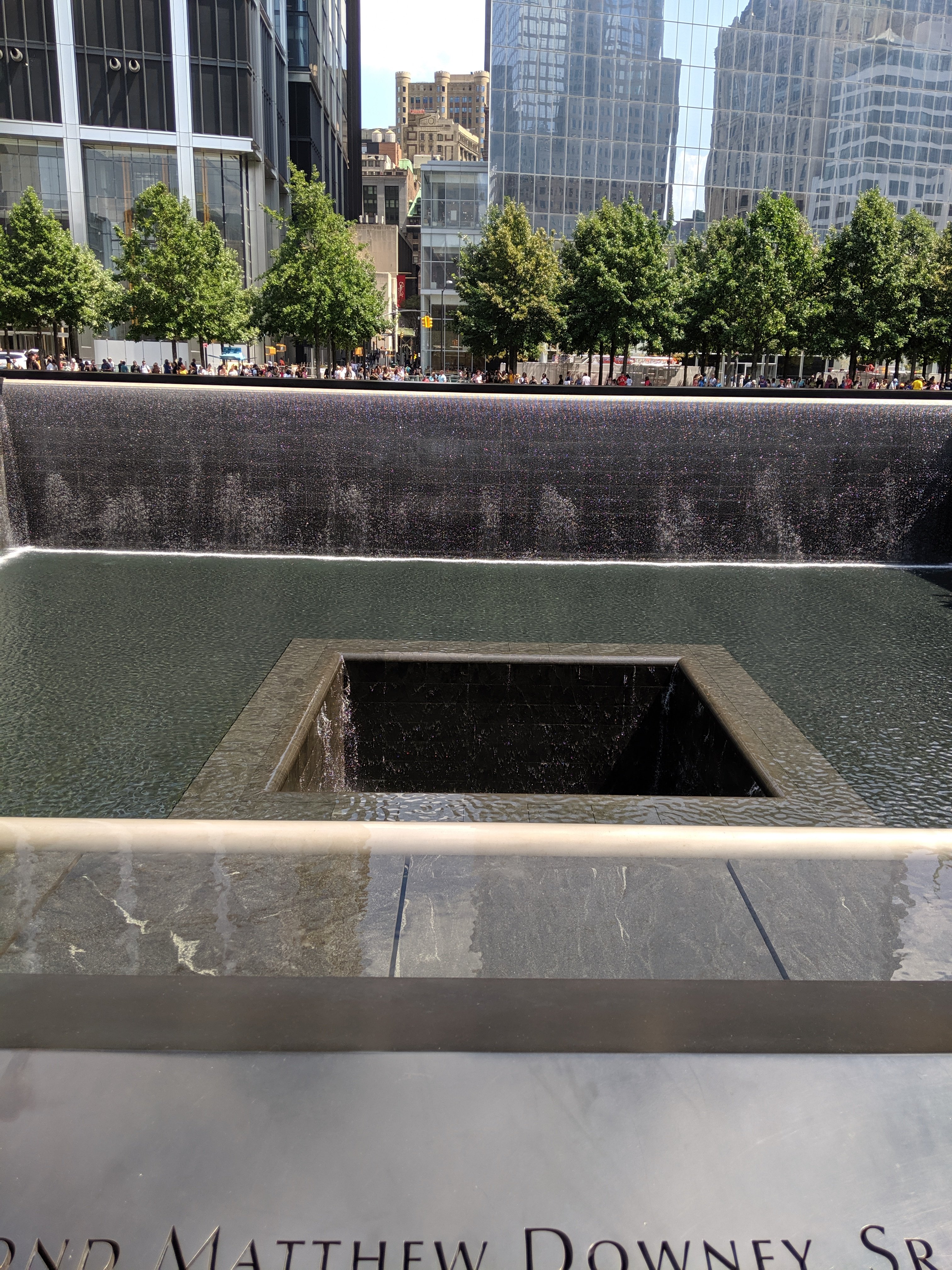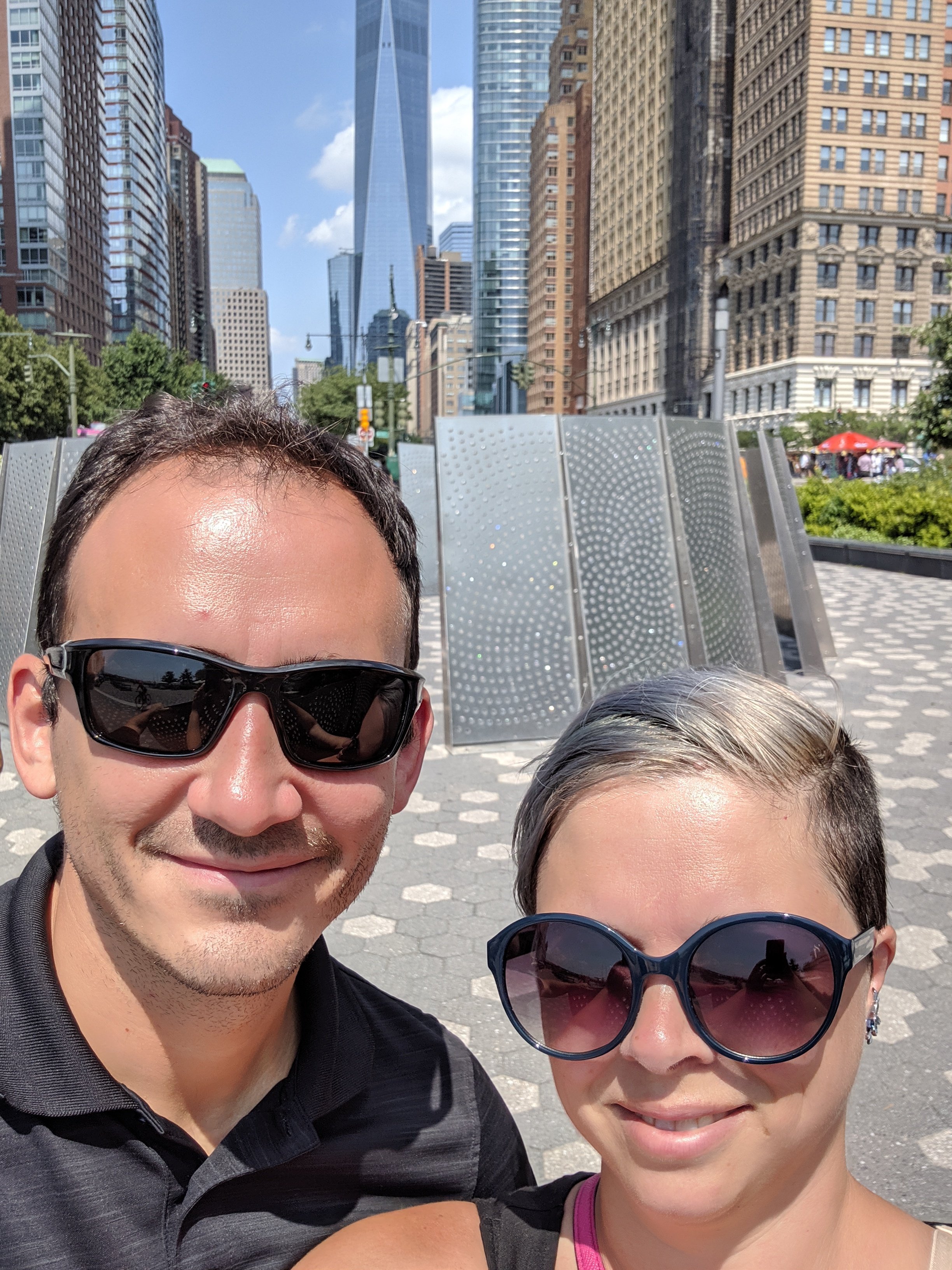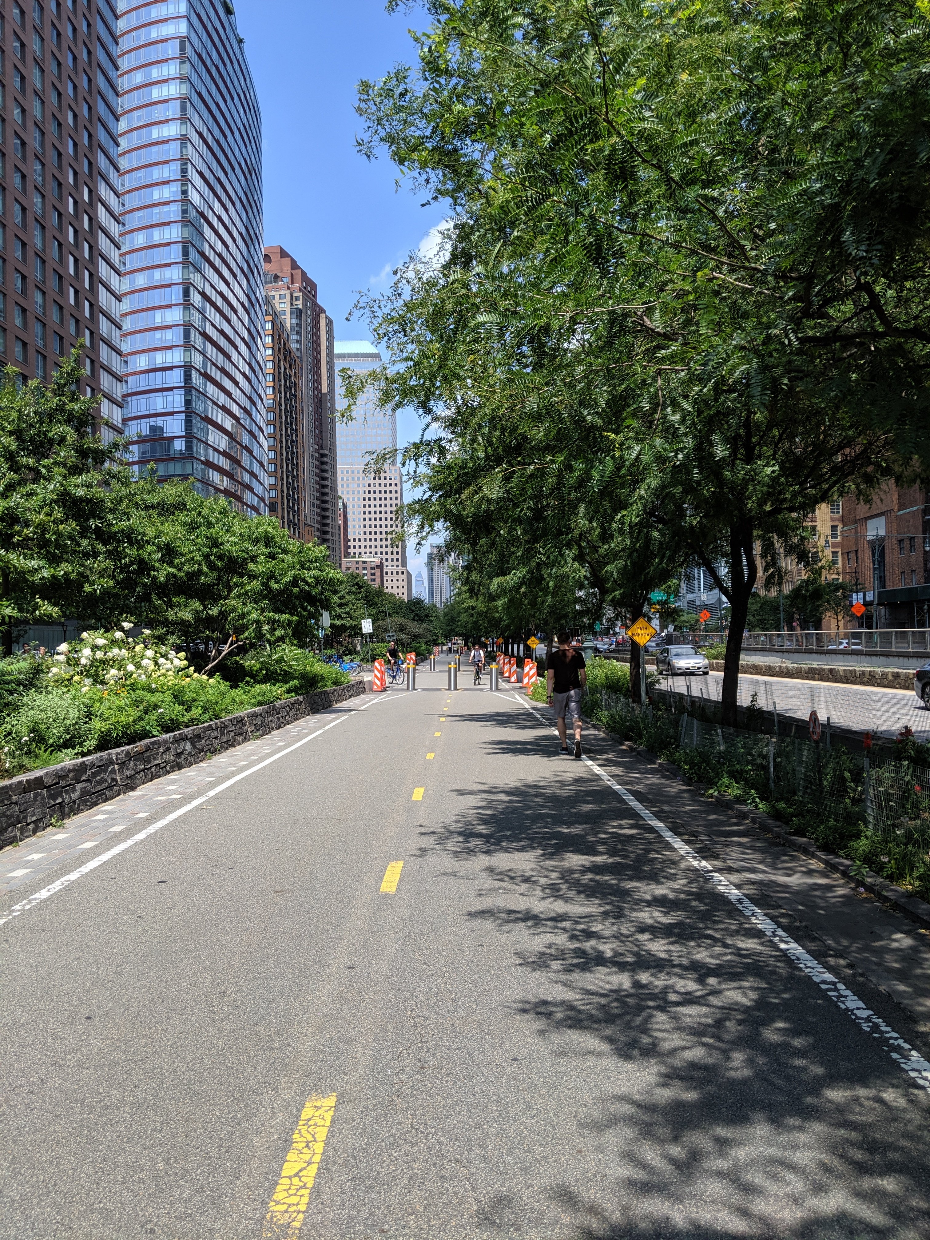 Since we were in the area, we walked by the Friends apartment.Admiring the Friends building.Merchant marine memorial, which is eerie.Outside Battery Park.We biked a little more than five miles from Battery Park to Hell’s Kitchen on this lovely bike path.World Trade Center memorial.