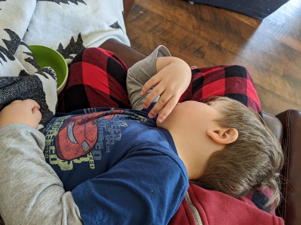 We have so far: played Legos, watched The Gruffalo’s Child, started the Lion King, read many stories, played with Spiderman and Black Panther, he’s taken a bath, eaten nearly all the grapes in the house, rejected blueberries, eaten half a peach yogurt, watched YouTube, and cuddled.
