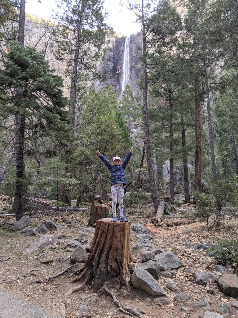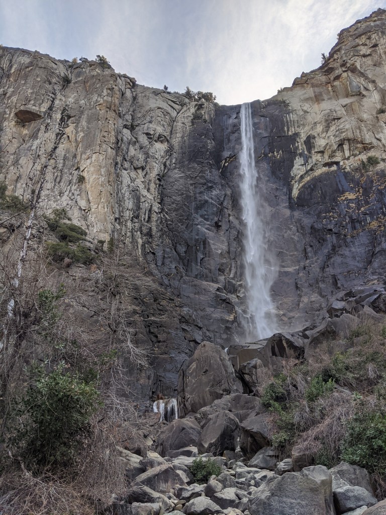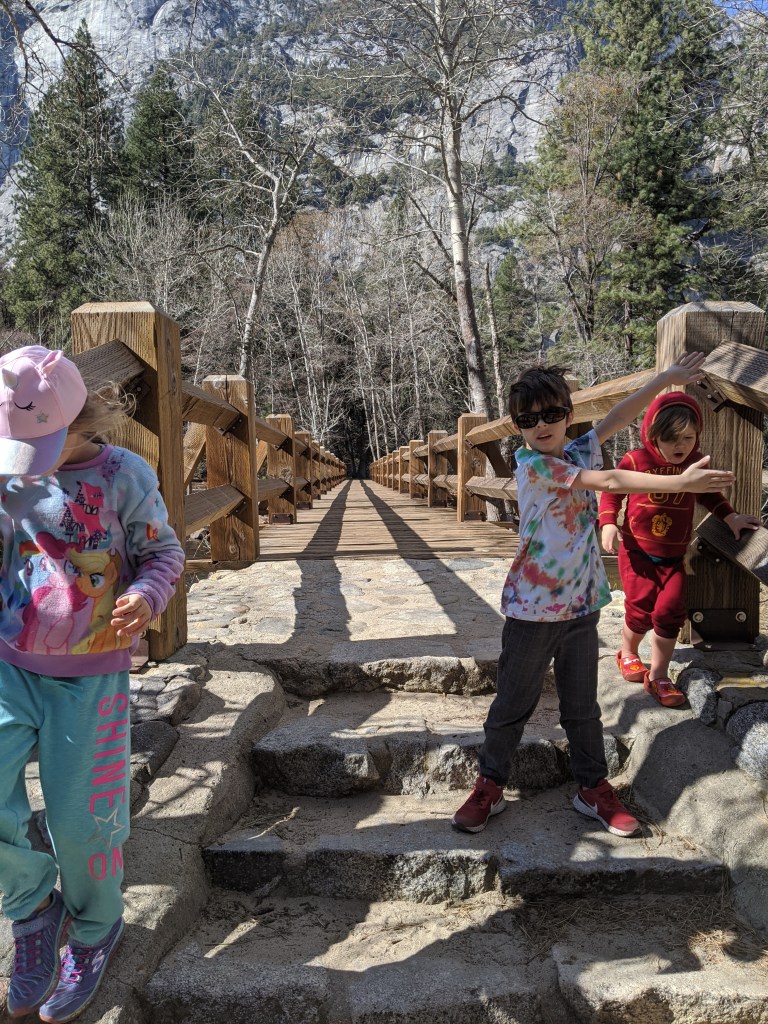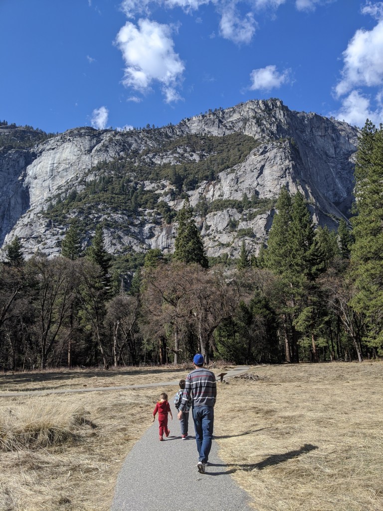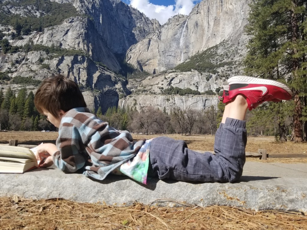 We spent two nights in Yosemite, and it was not enough. We had glorious weather, that begged we stay outside, so we did. We arrived in the early afternoon, and parked across the meadow from Yosemite Falls. We ate our lunch gazing across the dormant grasses at the series of falls, and craning up at the top edges of the hanging valleys all around. We walked to Yosemite Falls, Bridal Veil Falls, and halfway to Vernal Falls. Horsetail was, alas, dry, so no firefalls for us this year. Bob and Henry woke up early to climb up some part of Yosemite Falls, and saw a bobcat! A raccoon visited our balcony, and Grant attempted to let it in. All in all, it was an adventure. Selected pictures:
