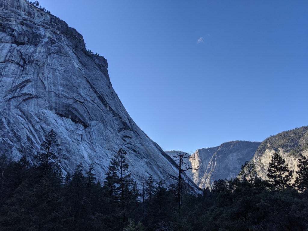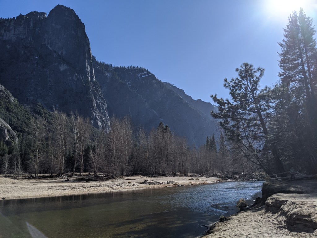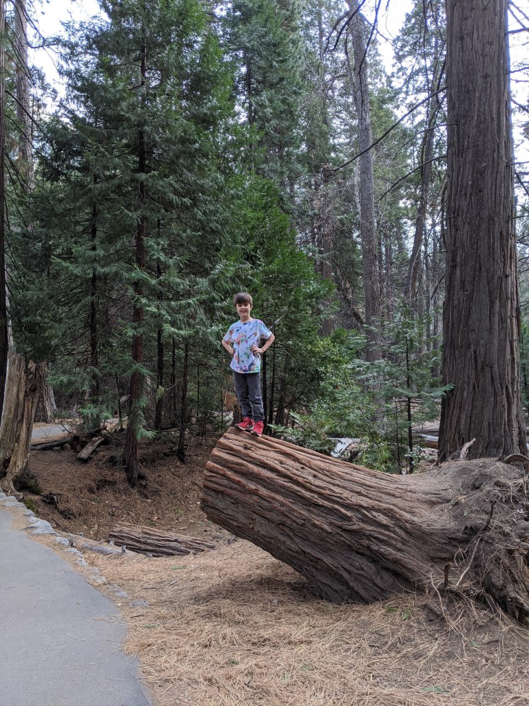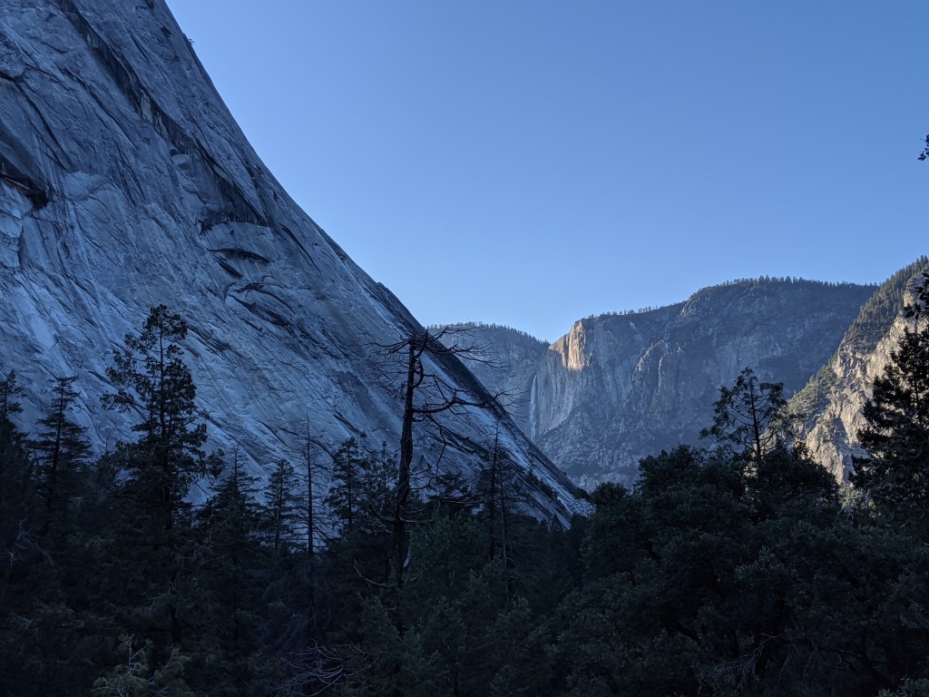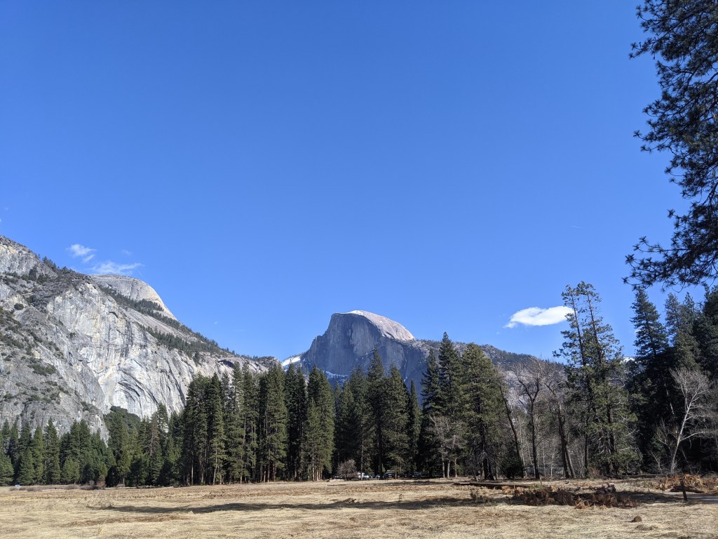 We spent two nights in Yosemite, and it was not enough. We had glorious weather, that begged we stay outside, so we did. We arrived in the early afternoon, and parked across the meadow from Yosemite Falls. We ate our lunch gazing across the dormant grasses at the series of falls, and craning up at the top edges of the hanging valleys all around. We walked to Yosemite Falls, Bridal Veil Falls, and halfway to Vernal Falls. Horsetail was, alas, dry, so no firefalls for us this year. Bob and Henry woke up early to climb up some part of Yosemite Falls, and saw a bobcat! A raccoon visited our balcony, and Grant attempted to let it in. All in all, it was an adventure. Selected pictures: