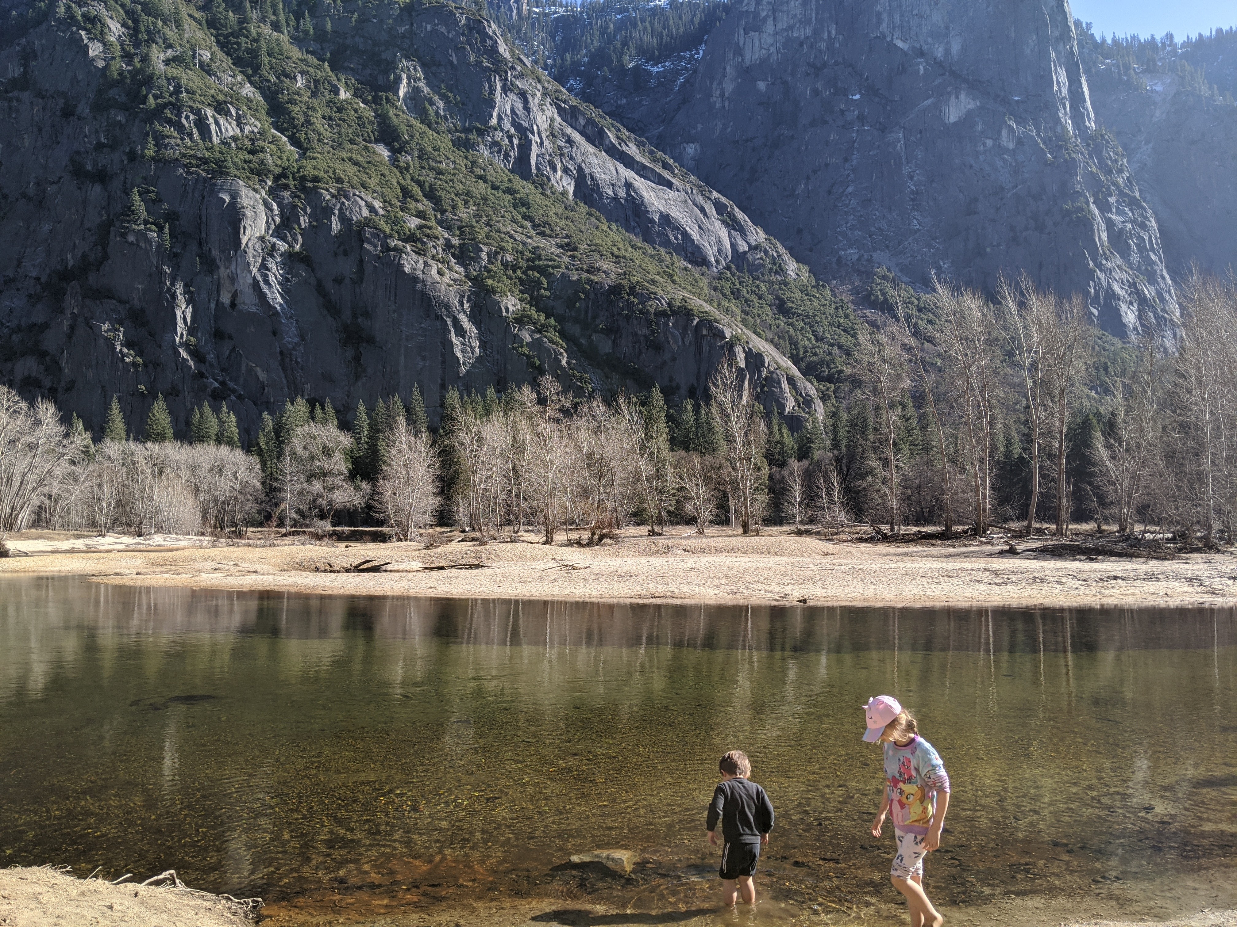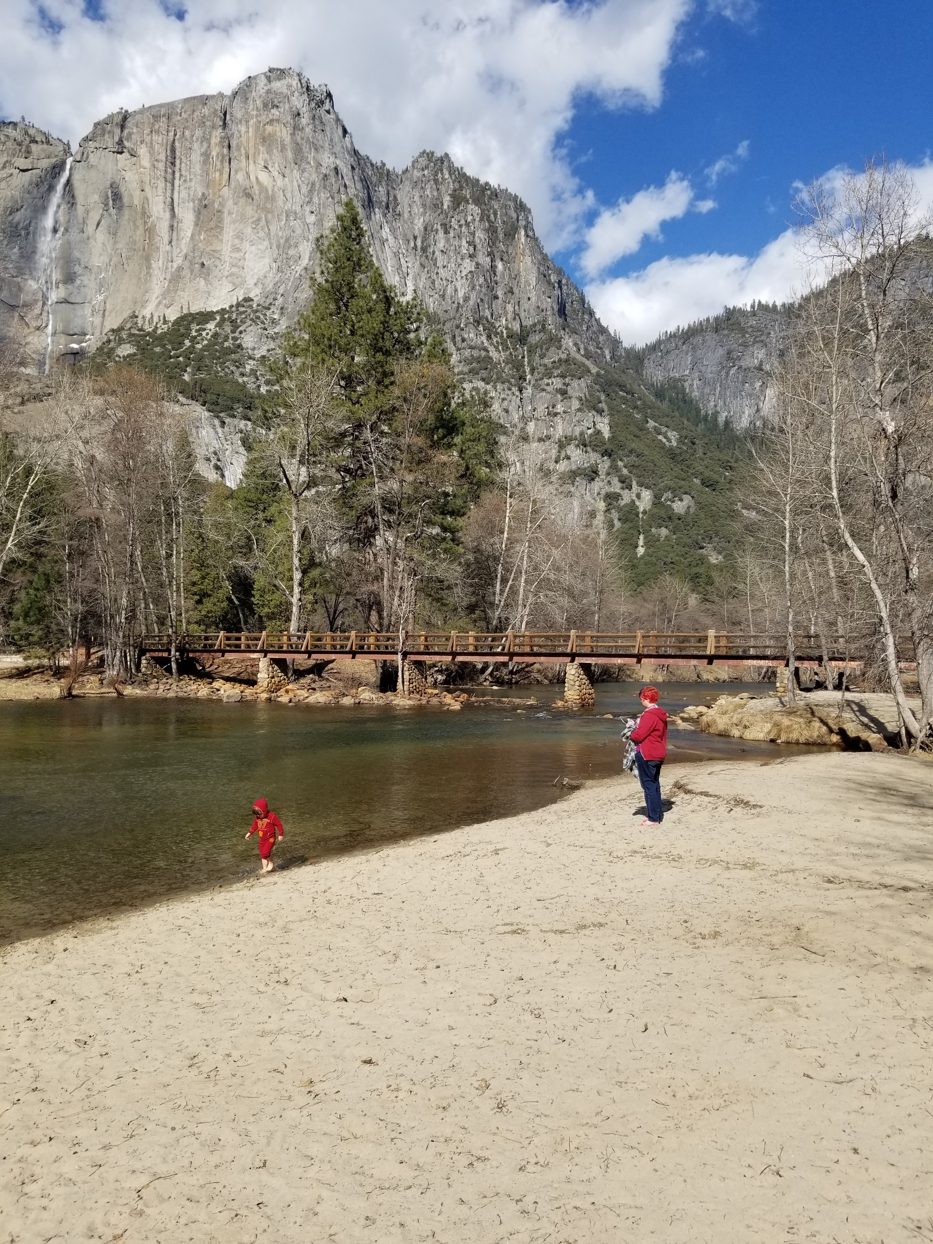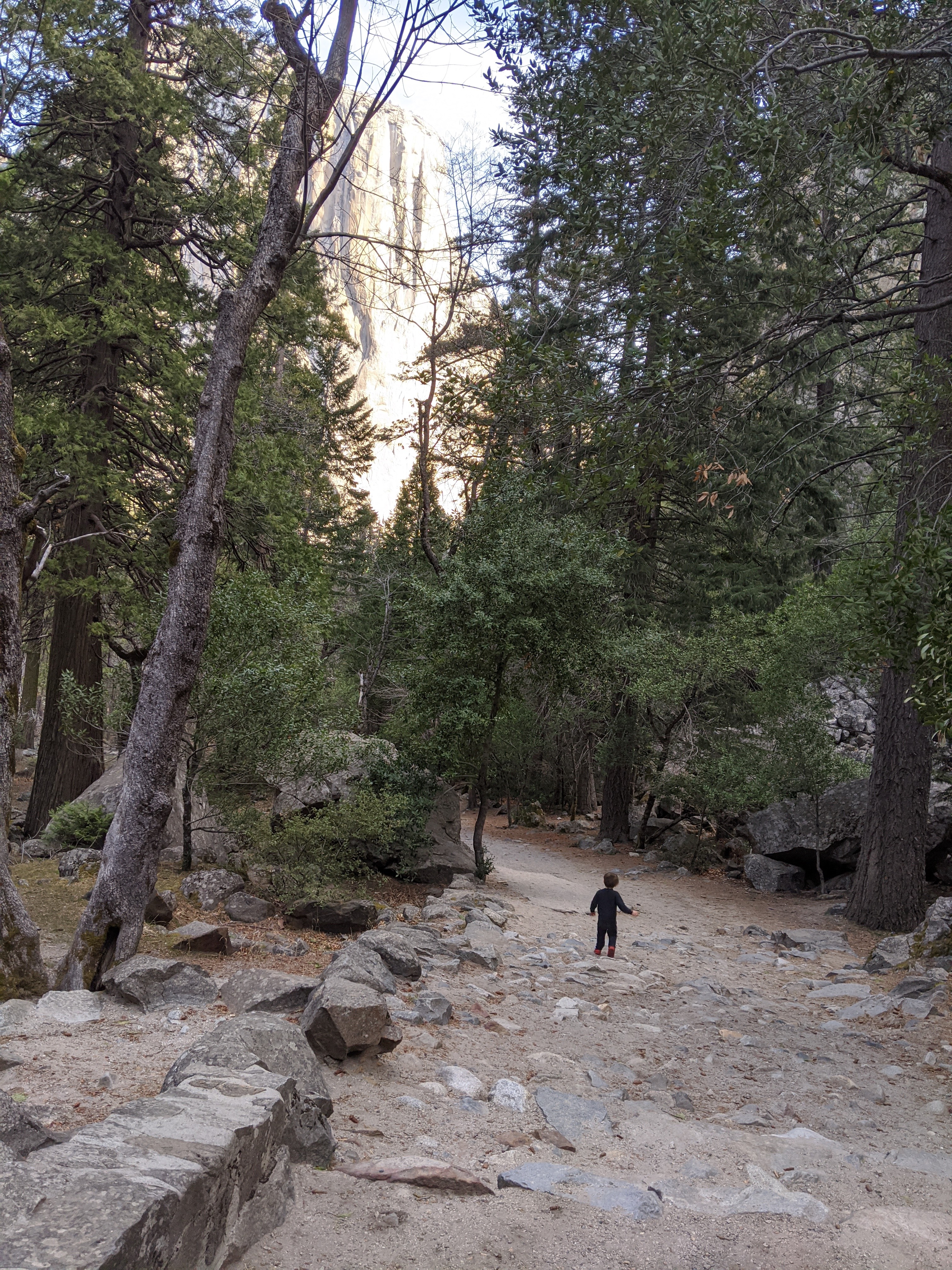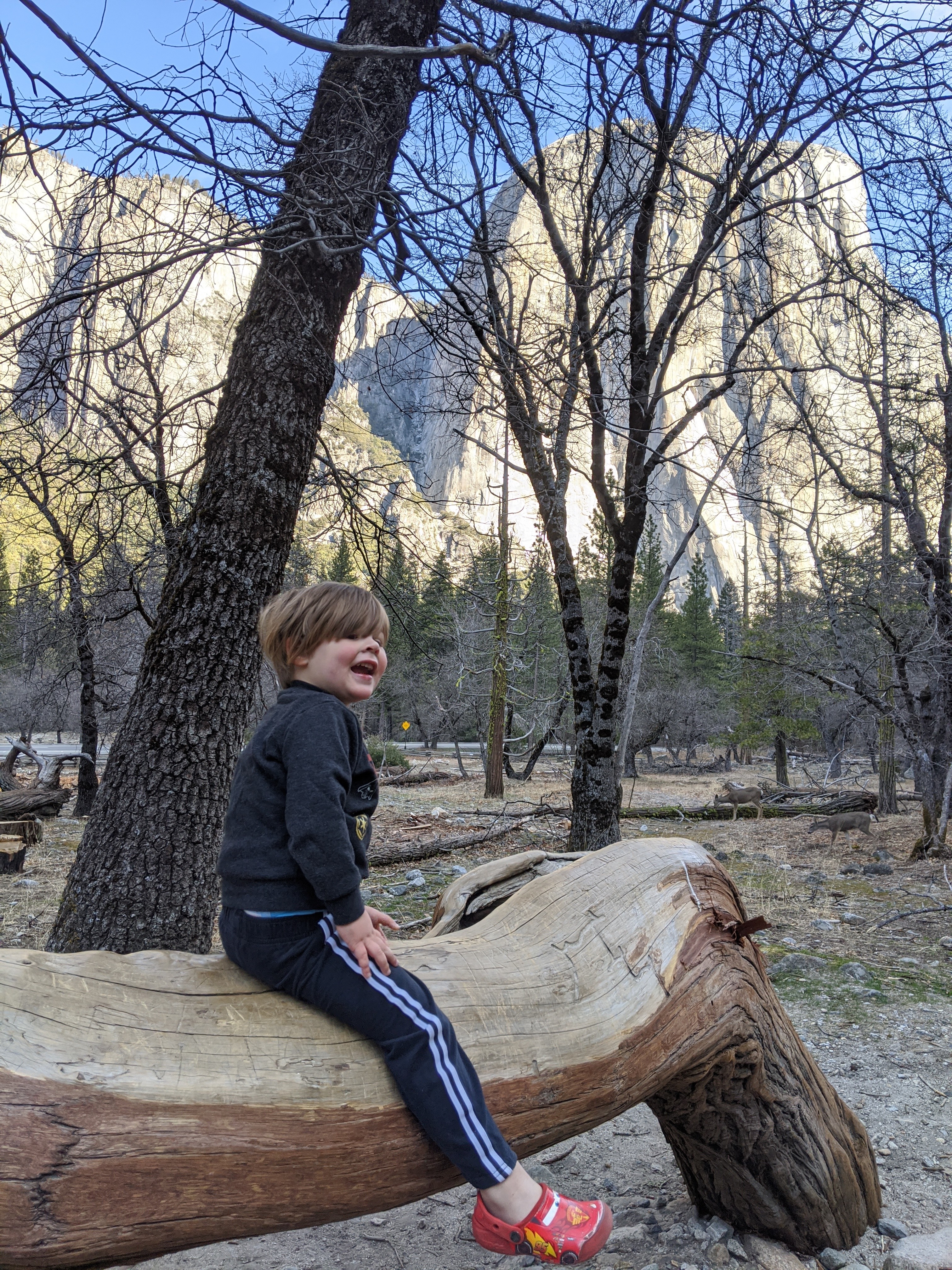 We spent two nights in Yosemite, and it was not enough. We had glorious weather, that begged we stay outside, so we did. We arrived in the early afternoon, and parked across the meadow from Yosemite Falls. We ate our lunch gazing across the dormant grasses at the series of falls, and craning up at the top edges of the hanging valleys all around. We walked to Yosemite Falls, Bridal Veil Falls, and halfway to Vernal Falls. Horsetail was, alas, dry, so no firefalls for us this year. Bob and Henry woke up early to climb up some part of Yosemite Falls, and saw a bobcat! A raccoon visited our balcony, and Grant attempted to let it in. All in all, it was an adventure. Selected pictures: