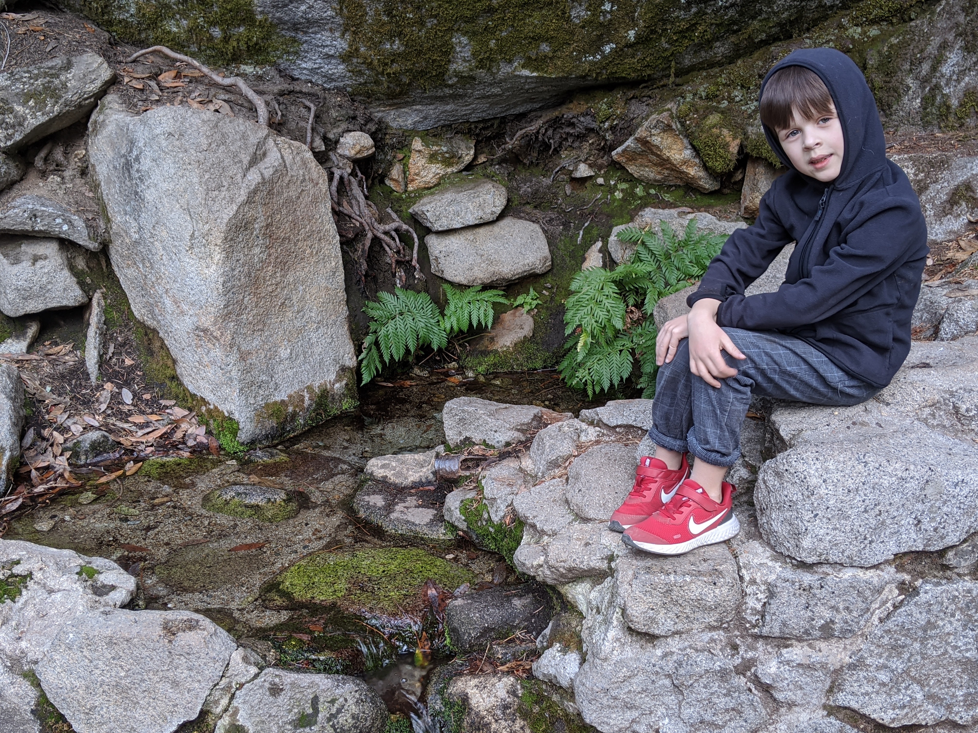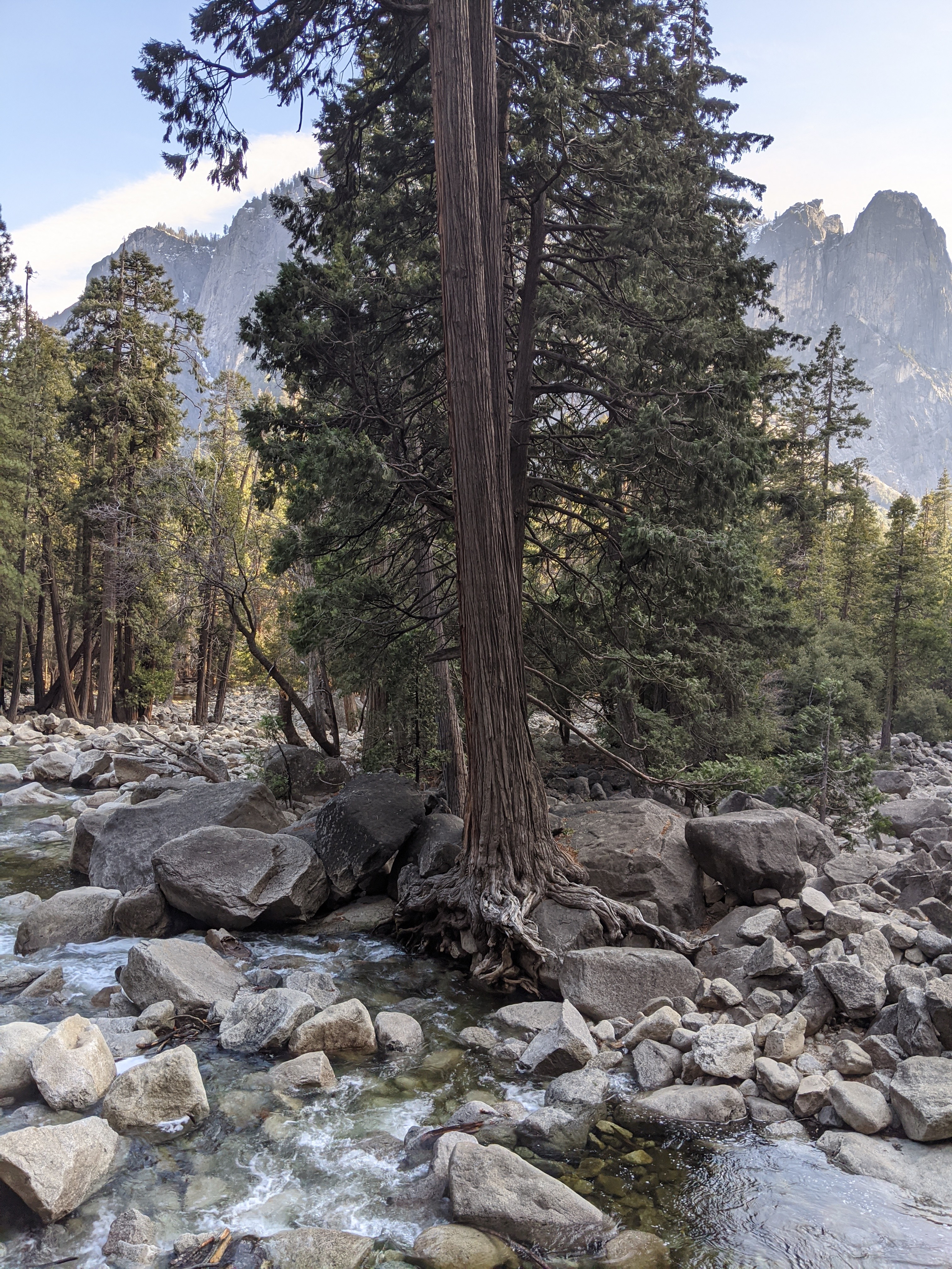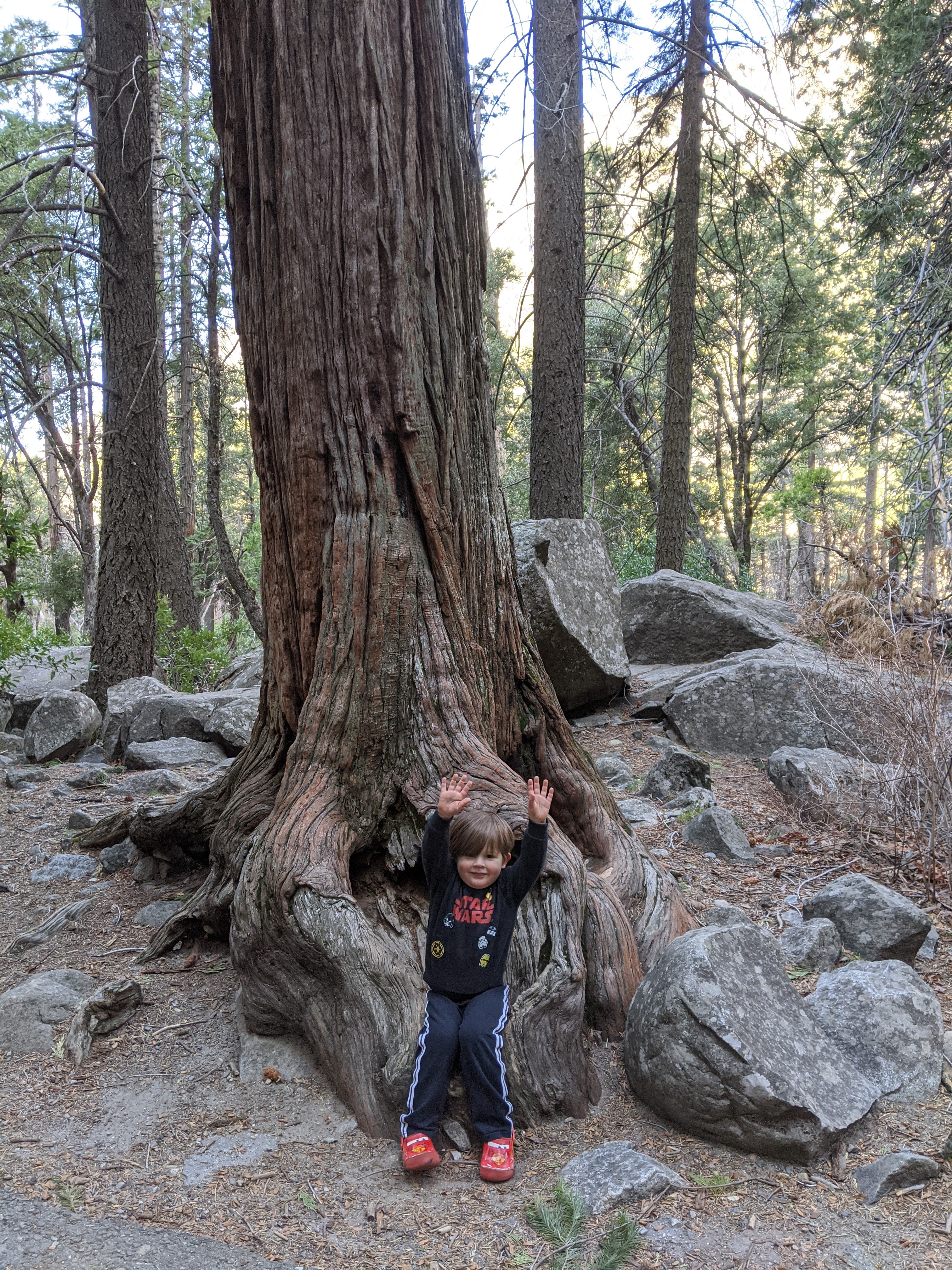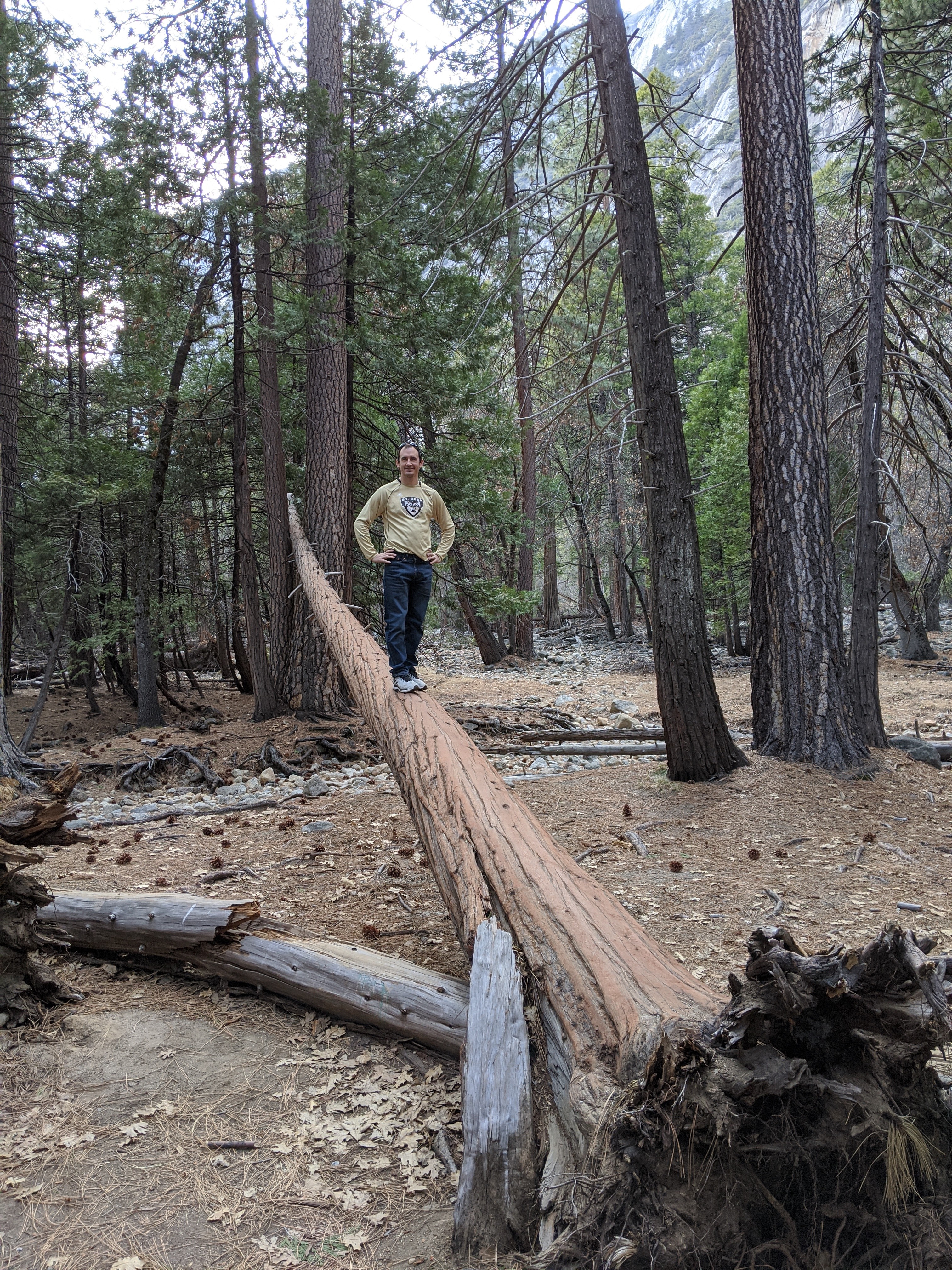 We spent two nights in Yosemite, and it was not enough. We had glorious weather, that begged we stay outside, so we did. We arrived in the early afternoon, and parked across the meadow from Yosemite Falls. We ate our lunch gazing across the dormant grasses at the series of falls, and craning up at the top edges of the hanging valleys all around. We walked to Yosemite Falls, Bridal Veil Falls, and halfway to Vernal Falls. Horsetail was, alas, dry, so no firefalls for us this year. Bob and Henry woke up early to climb up some part of Yosemite Falls, and saw a bobcat! A raccoon visited our balcony, and Grant attempted to let it in. All in all, it was an adventure. Selected pictures: