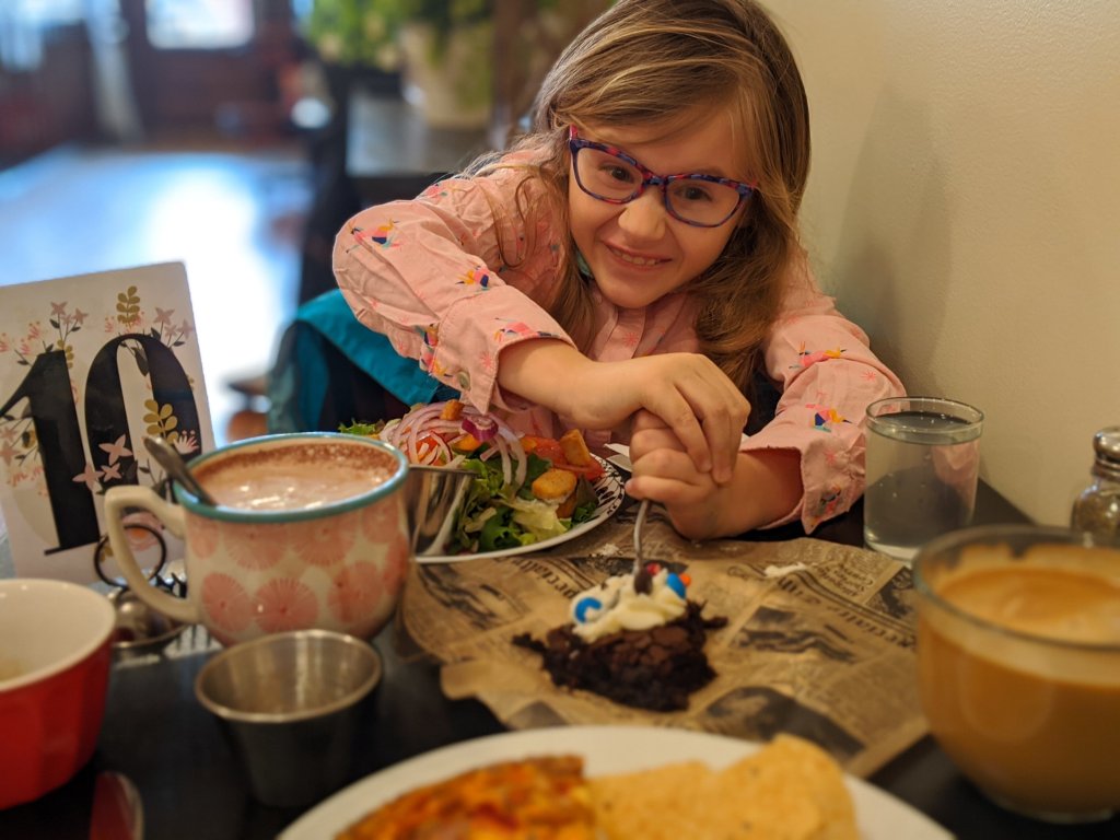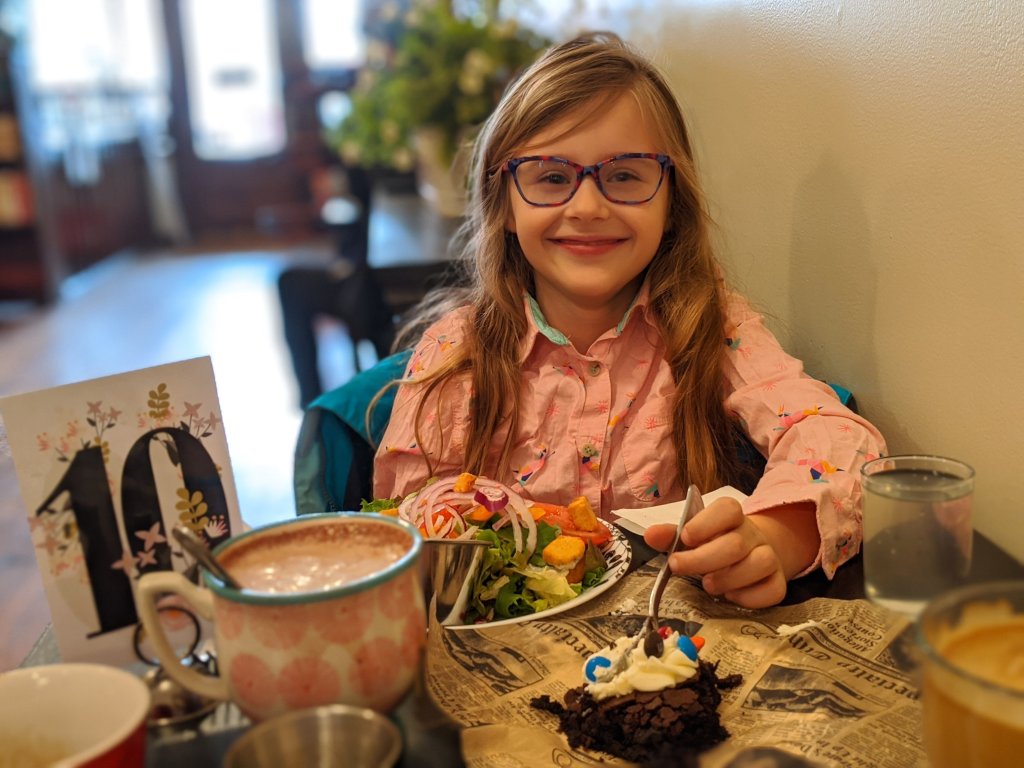 I took my best girl on a lunch date today. She chose the brownie and a side salad, with a deluxe hot chocolate.