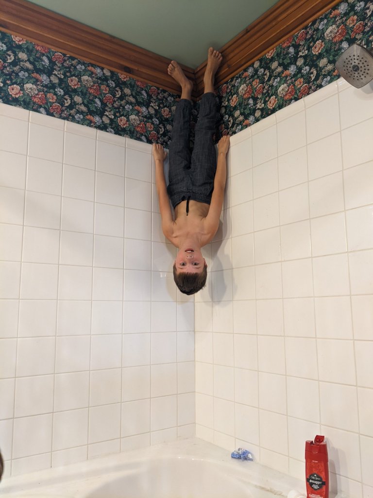 I told him never again in the bathroom. You gotta have boundaries about what rooms they can walk on the ceiling in, you know?