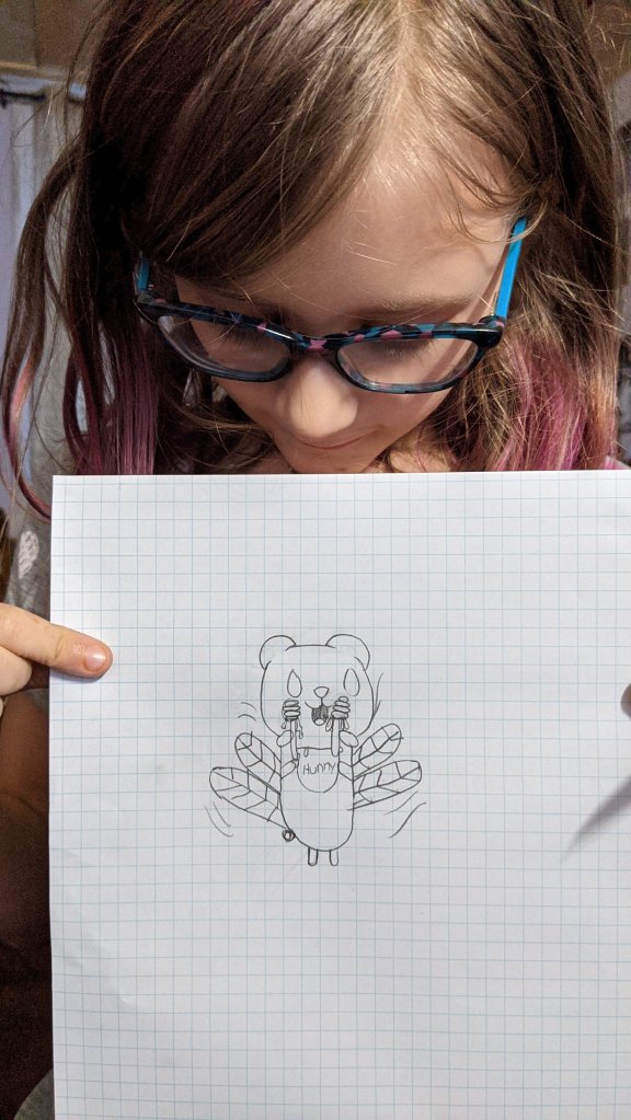 Eleanor has watched a tutorial, and is busy producing adorable drawings. This one is my favorite and it’s called Hunny Bear.