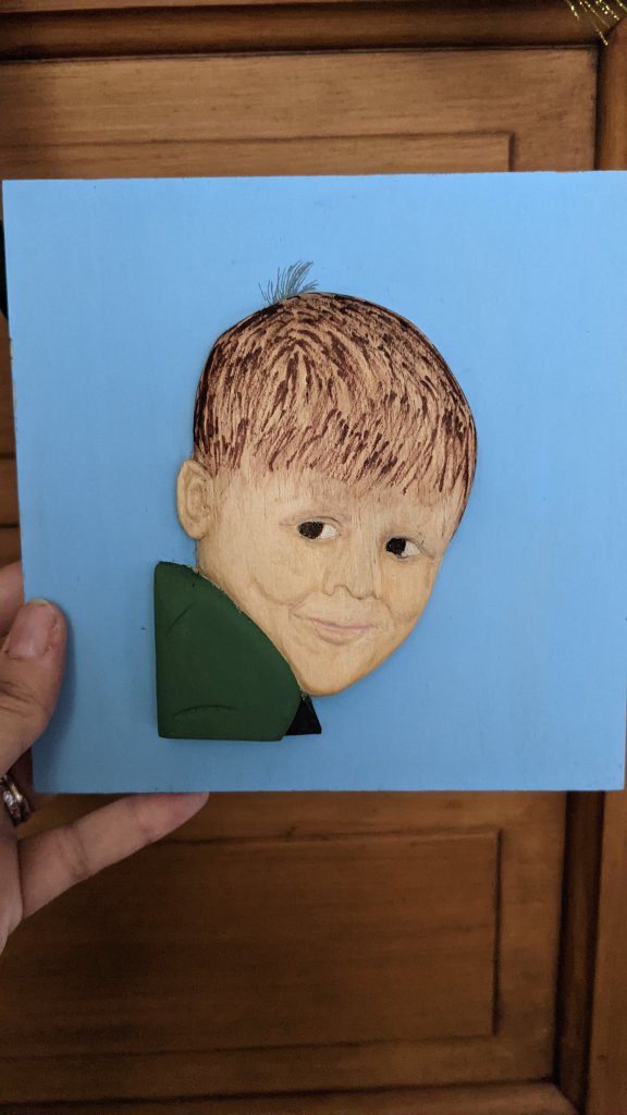 My dad made these low-relief carvings of all three kids. He started with Grant, then Henry, then Eleanor. They’re all wonderful pieces that I’ll cherish, but I can’t get over the depth that he achieved around Ele’s neck.