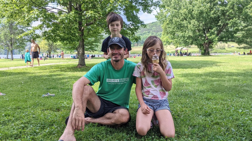Bob with the twins who made him a dad (and Grant in a blue shirt wandering off in the distance).