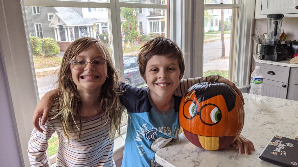 At the school bookfair the other night, both of the twins entered a raffle to win a painted pumpkin. Henry won one of three pumpkins! He picked Harry Pumpkin. Finally, a triplet for the twins.