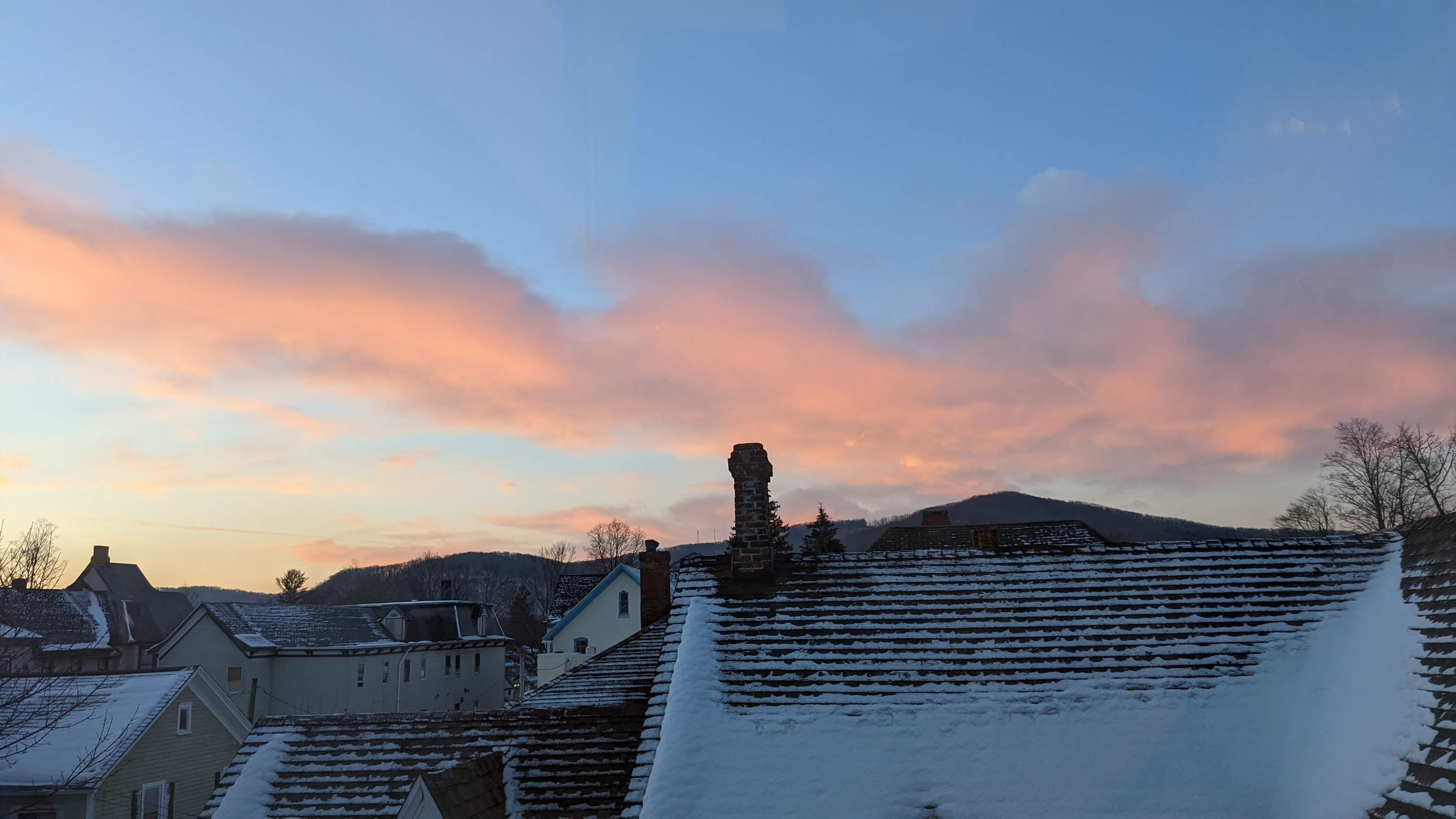 Anyway, here’s a very pretty (imo) photo of the rooftops out the skylight this morning. Auspicious sky, suspicious snow.