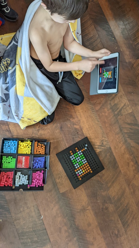 A few years ago I got Henry this game (kit?) called Bloxels. It comes with all these small plastic blocks and a grid to place them in. The idea is that you use the grid to build game components by hand, scan them into the app, and then you can put together all the components and actually play the game on whatever device you have.