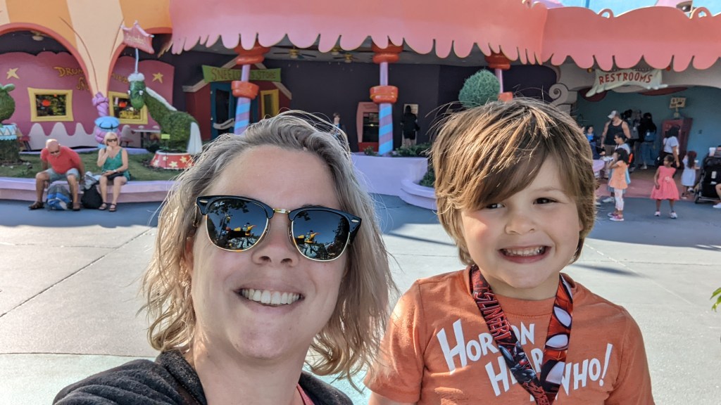 We went onwards to the Dr Suess area, and Grant loved the Cat in the Hat ride, and begged to go on the One Fish, Two Fish, Red Fish, Blue Fish ride. So he and I went on together!