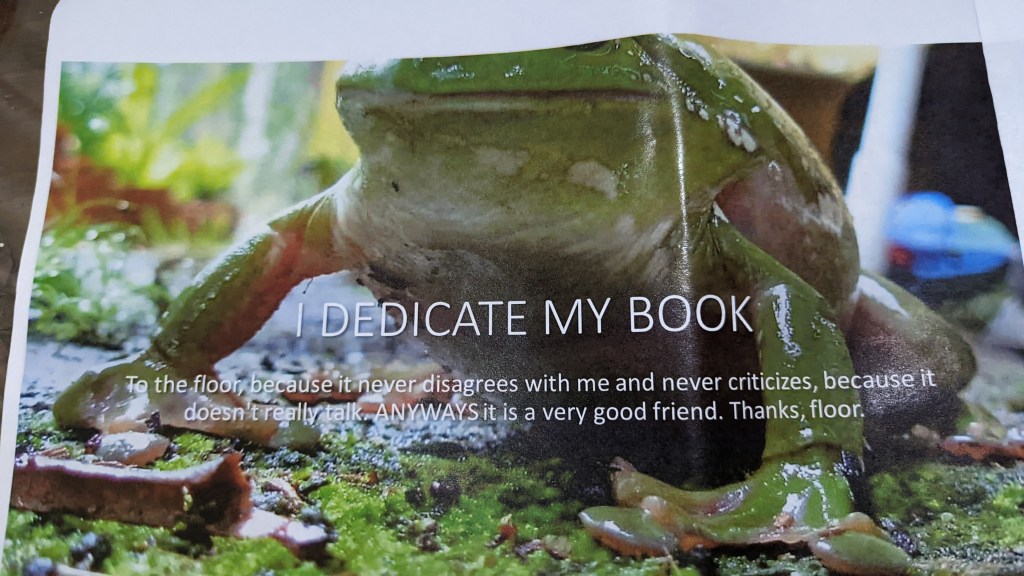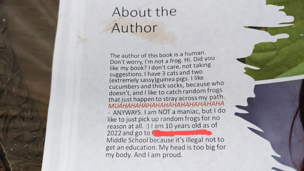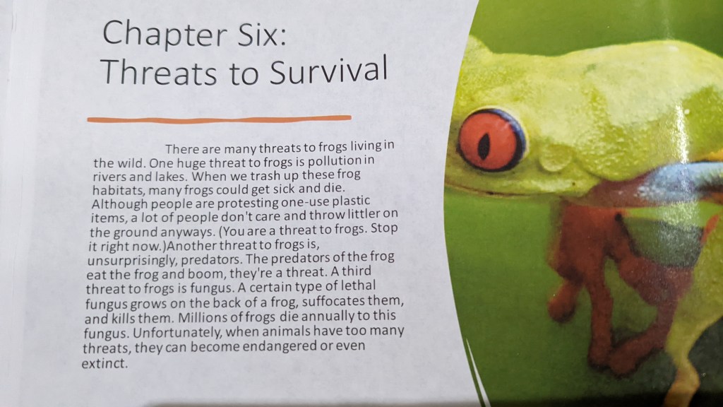 For a class project, Eleanor had to write a book about frogs. She did very well, and editorialized the hell out of it. I am proud.