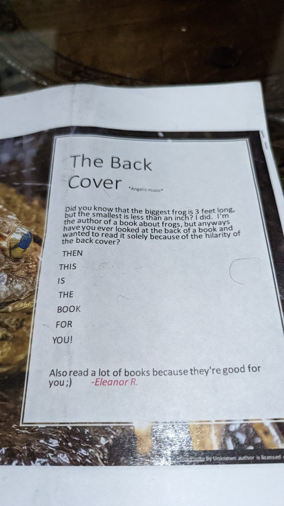 There is a lot more to this book, but it is actually about frogs, and I’d recommend checking wikipedia. I think that’s what Eleanor did.