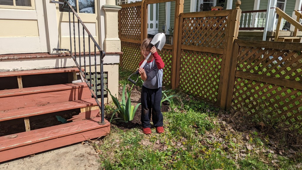 I was so pleased to be buying plants that I lost my head completely and got Grant a Grant-sized shovel. So he is most definitely weaponized now. I was hit by dirt often.