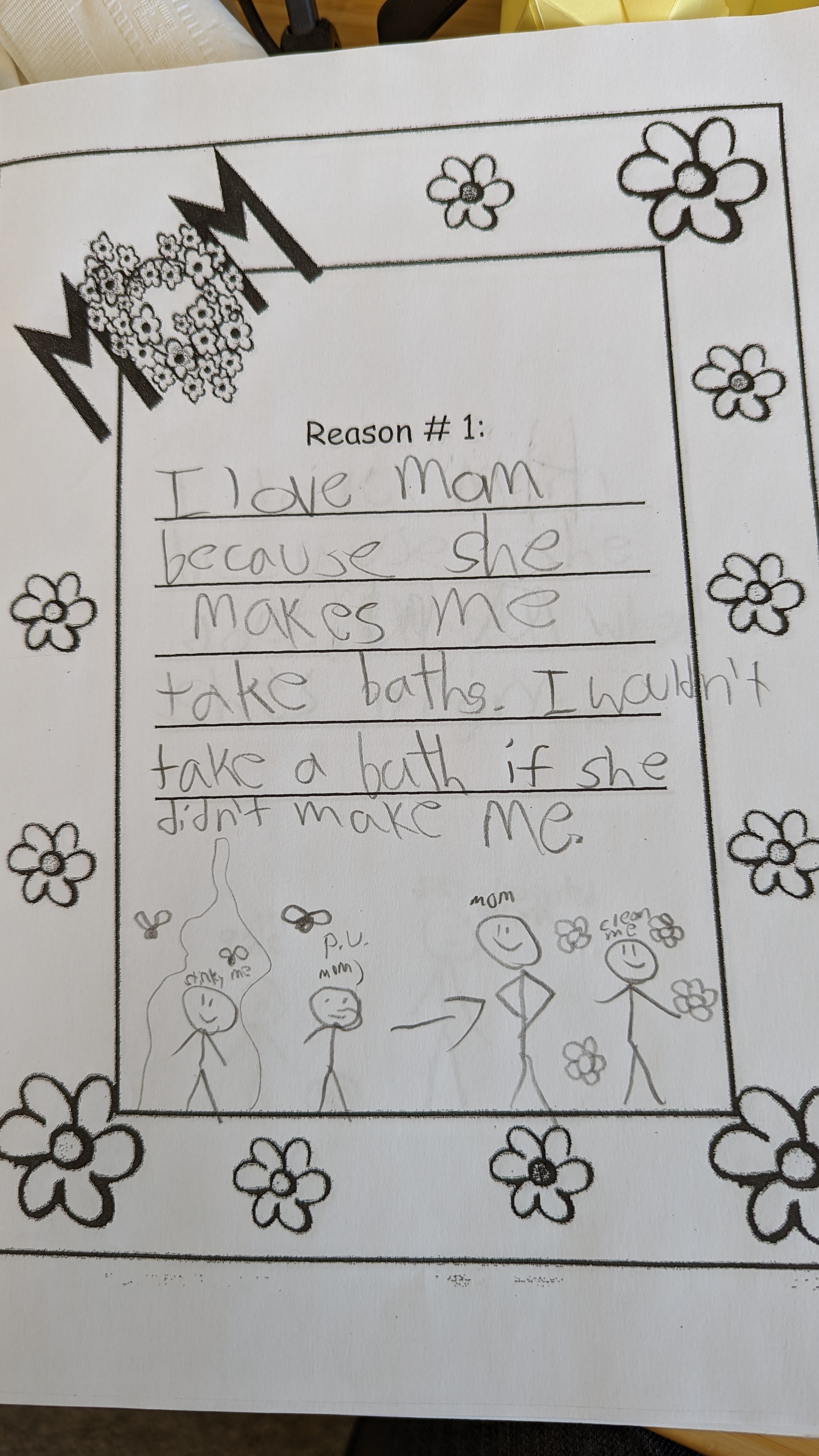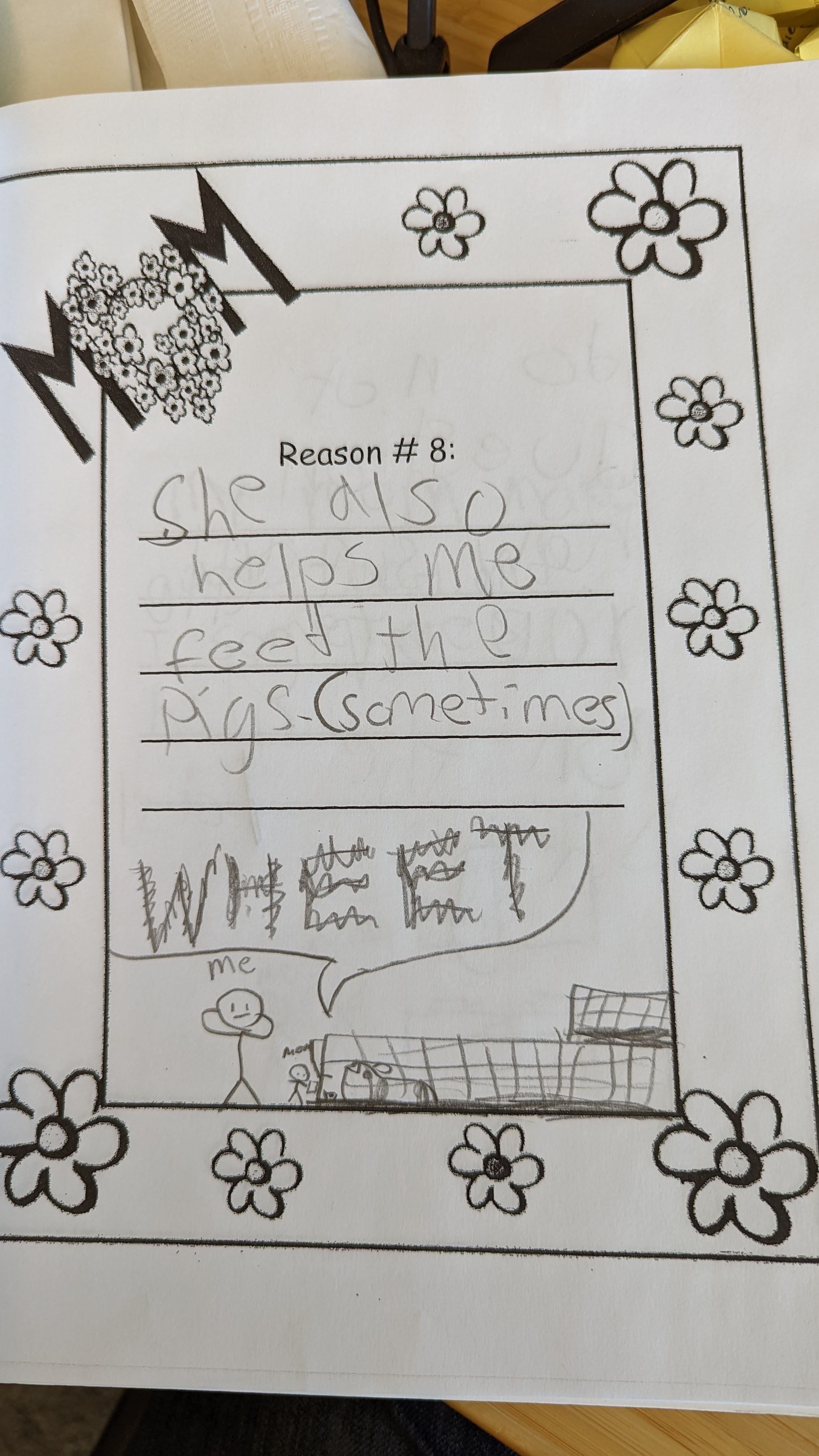 Remember for Mother’s day the sweet book Henry filled out for me? Well, being in the same grade, Eleanor did one too. Let’s take a look: