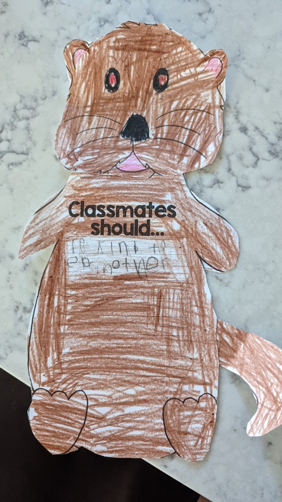 Grant made this on his first day of school. It says “Classmates should be kind to each other”.