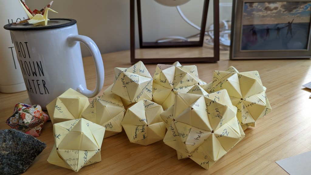 Some origami paper snuck into the mix – but it’s smaller than post-it size, so the squares are not interchangeable.