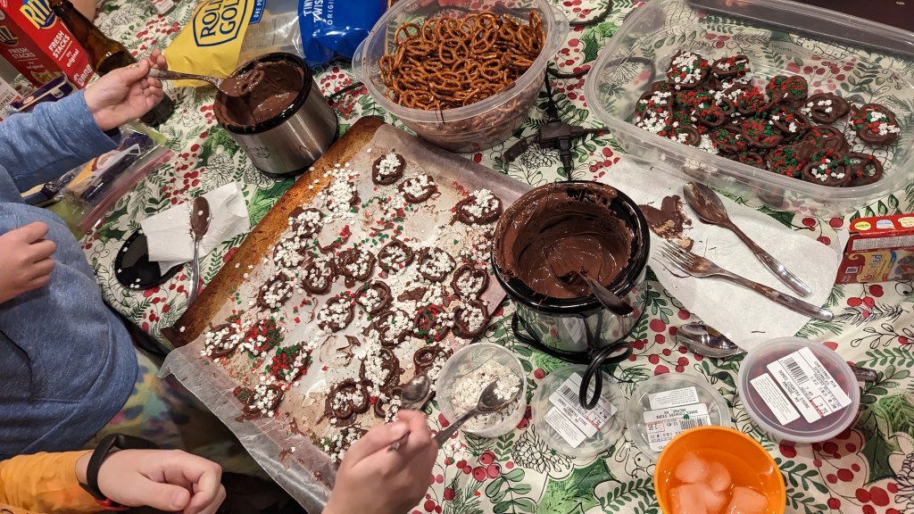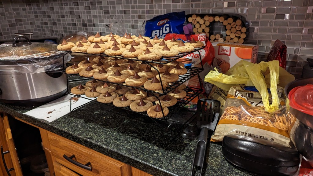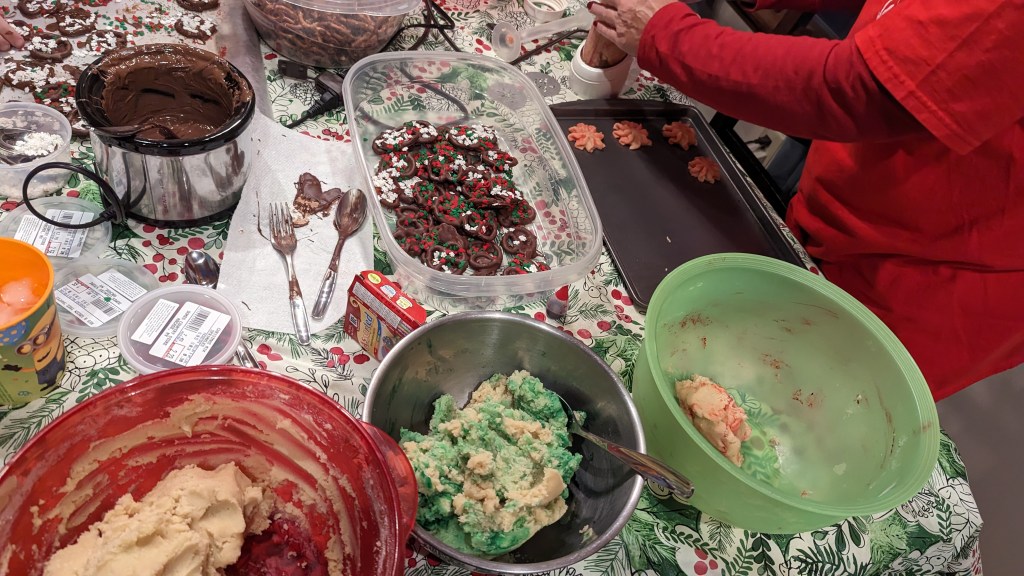 Every year, my mother-in-law hosts cookie day at her house before Christmas. My sister-in-law and I bring our kids over and we make about fifteen dozen cookies to split between us all for the holidays. We always make three kinds, and this year we chose peanut butter, spritz, and chocolate covered pretzels. The kids make the chocolate covered pretzels, and my MIL has a 48-year-old party pistol for the spritz. This year, my SIL pre-made the peanut butter dough, and my niece and I rolled all the cookies. It’s always fun! Someone always yells, kids end up crying, we talk a lot, and everyone has a good time.