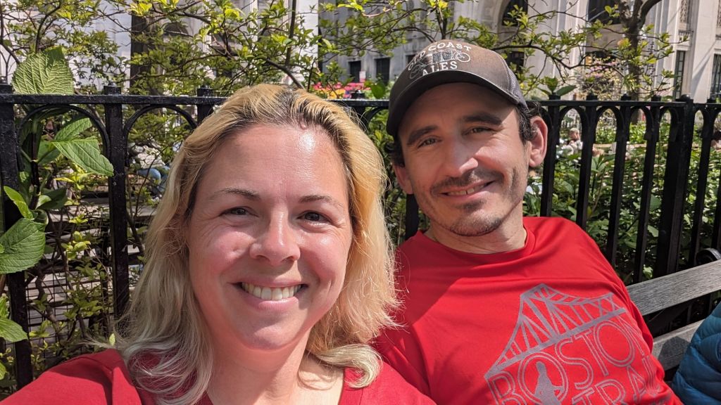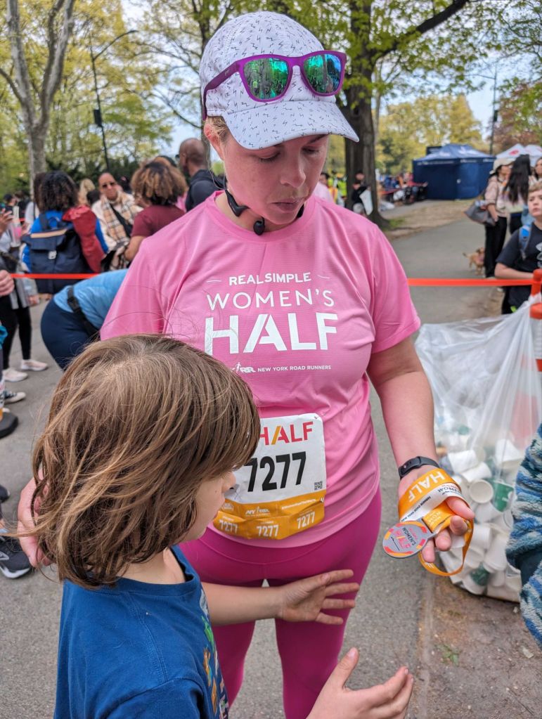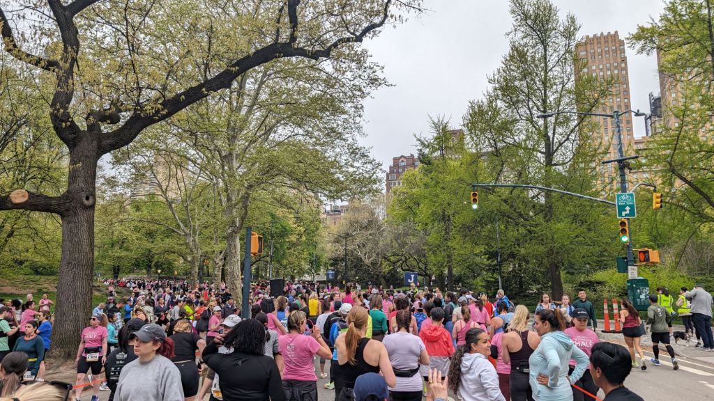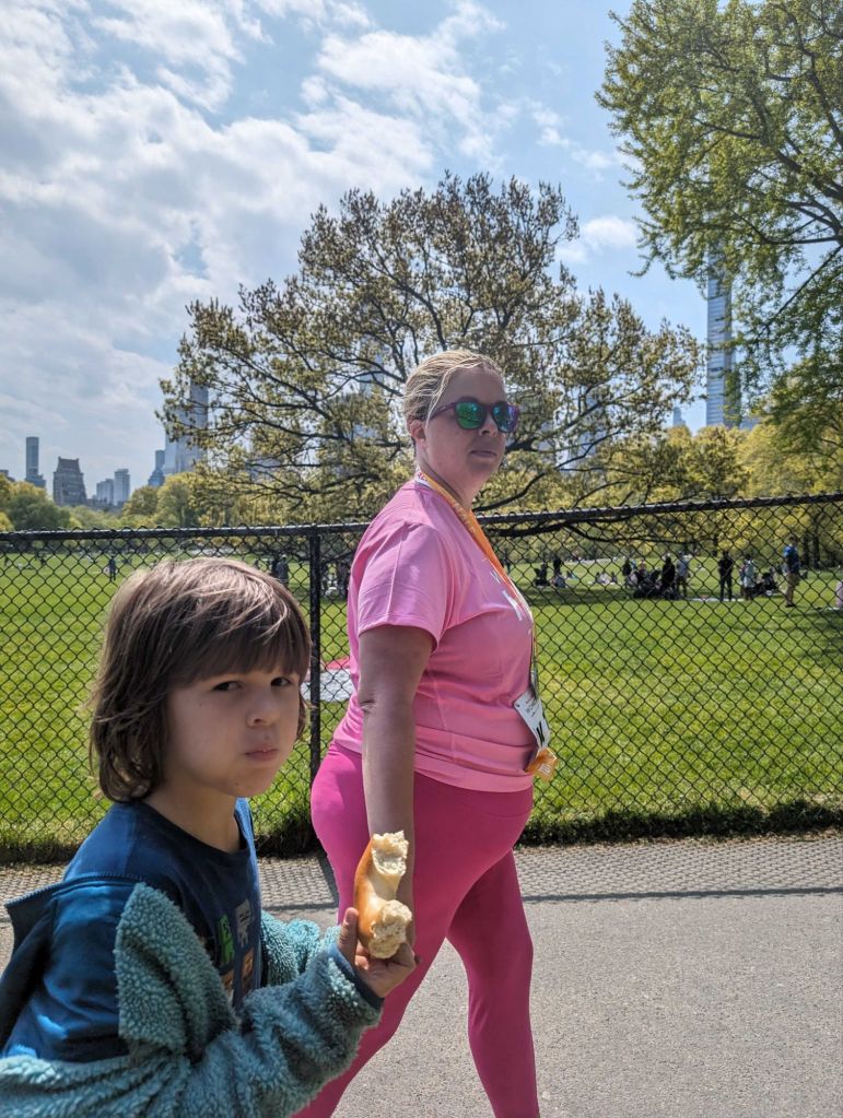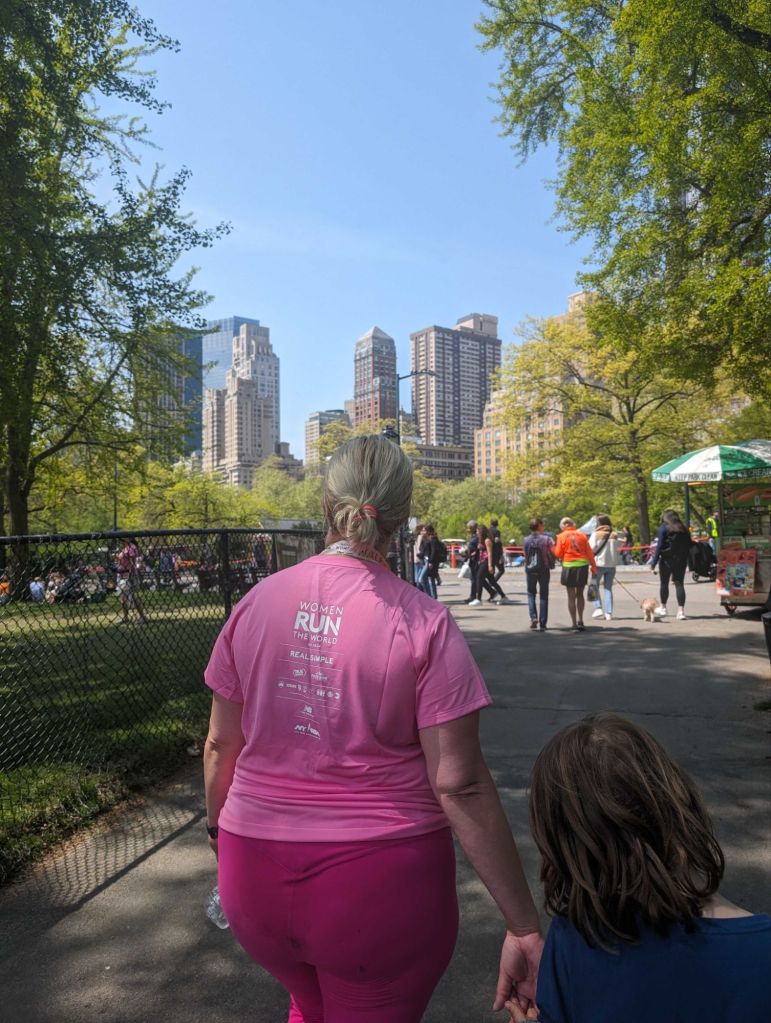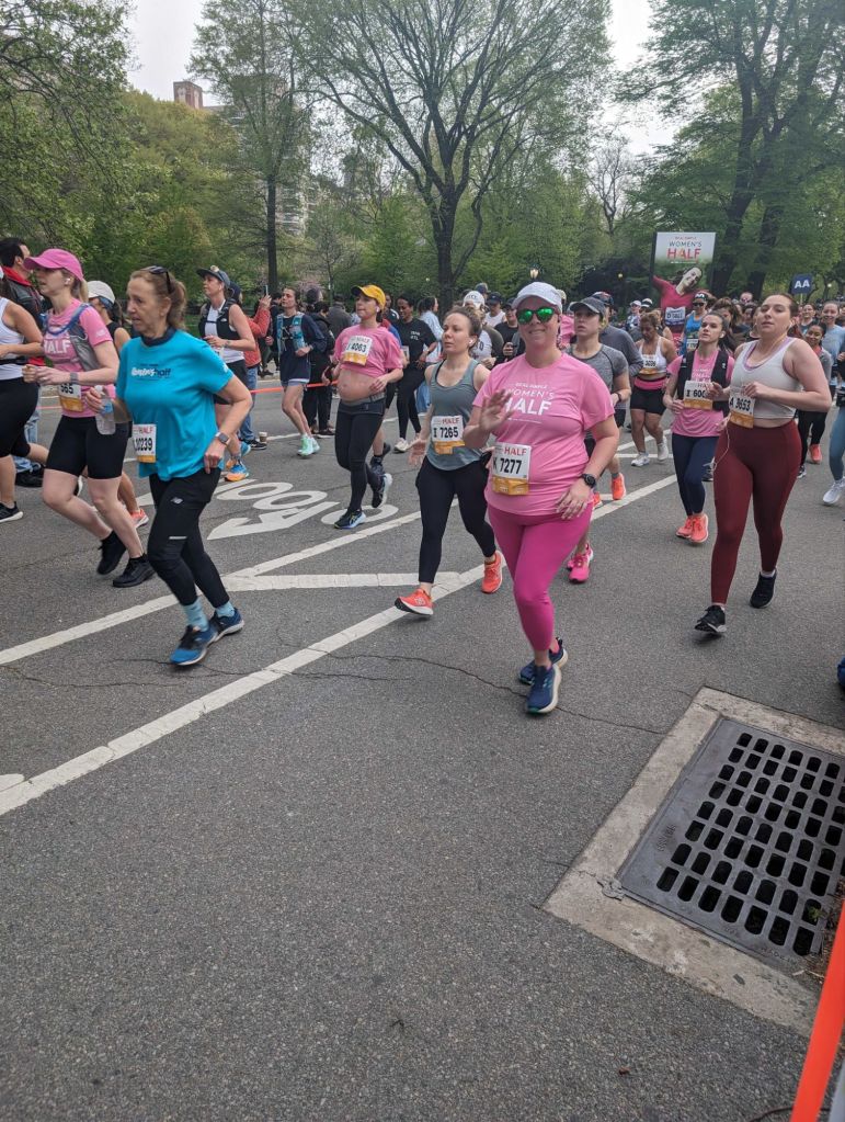 Yesterday, April 28, 2024, I got up at 6:30am after a very restless night (no surprise there). I got on my game face and body glide while Bob pinned my bib to my race shirt. I reviewed our strategy as we walked up the block for a smoothie (my usual breakfast), and back in the room I drank my tea and smoothie in alternating gulps, while Bob reminded me of our early morning plan. I would do my lunge matrix, then walk the block over to Central Park, find my corral, and call that my warm up. He would wrangle the Ringlets, and find me before the start.
