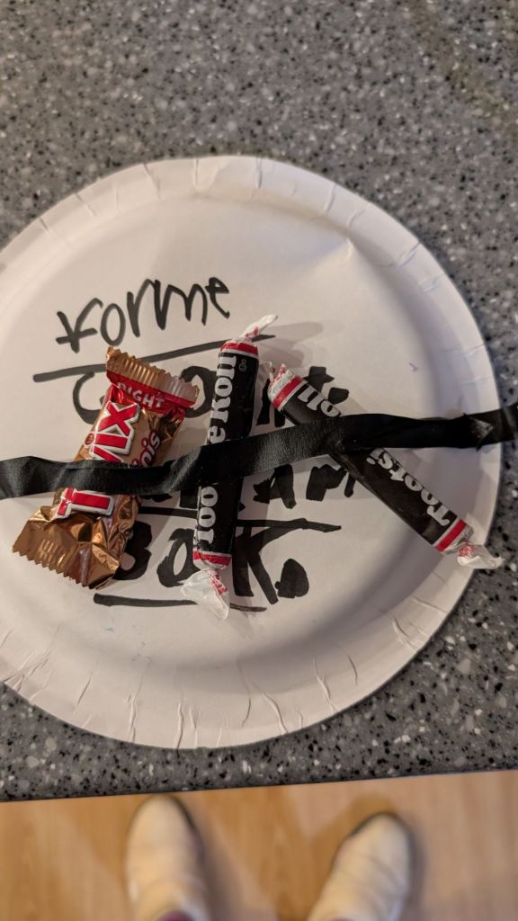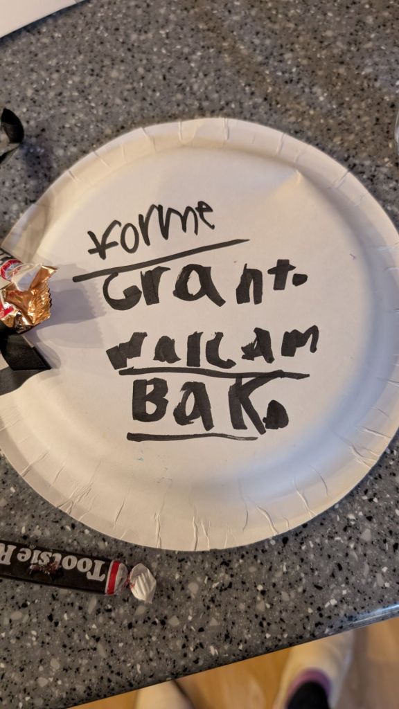 I was away for work for about 30 hours, and Grant missed me. He made me a welcome back goodie bag. Inside was pizza and candy!